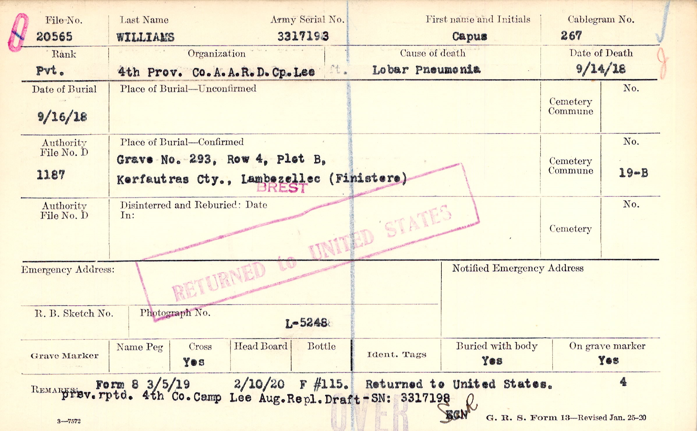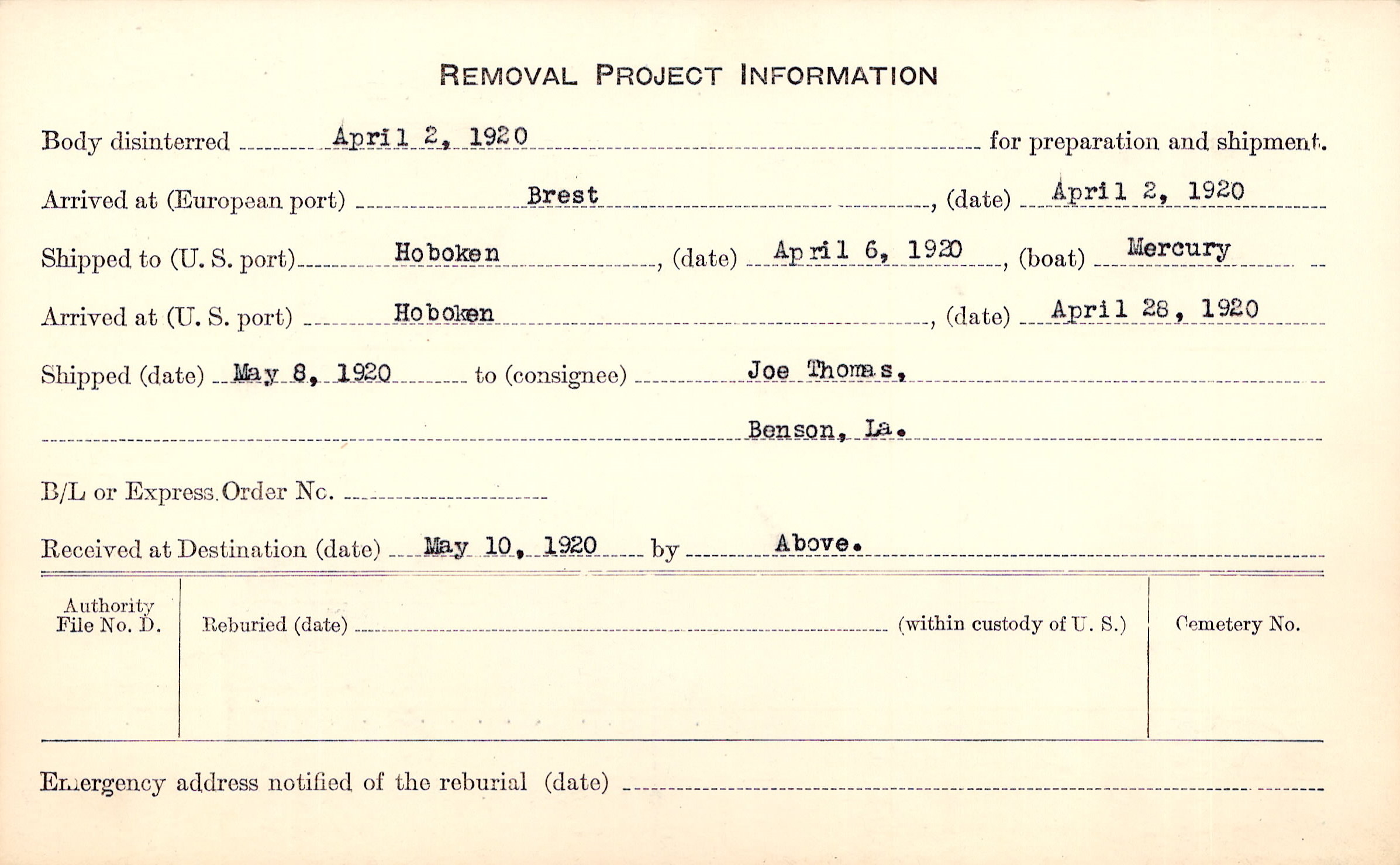 Body disinterred 4/2/1920 for preparation and shipment.