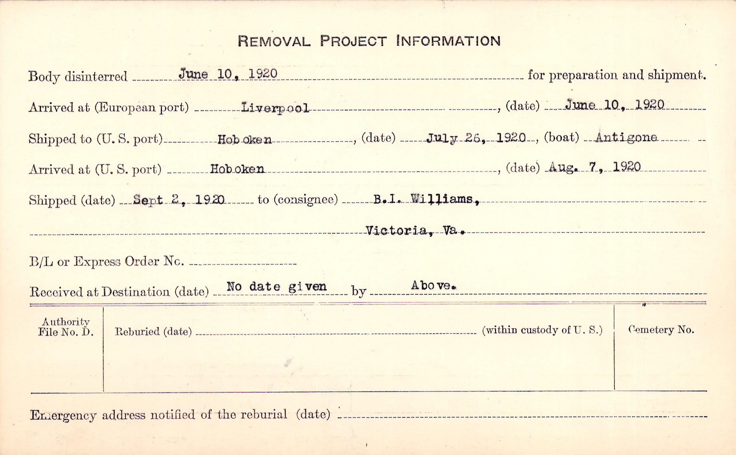 Body disinterred 6/10/1920 for preparation and shipment.