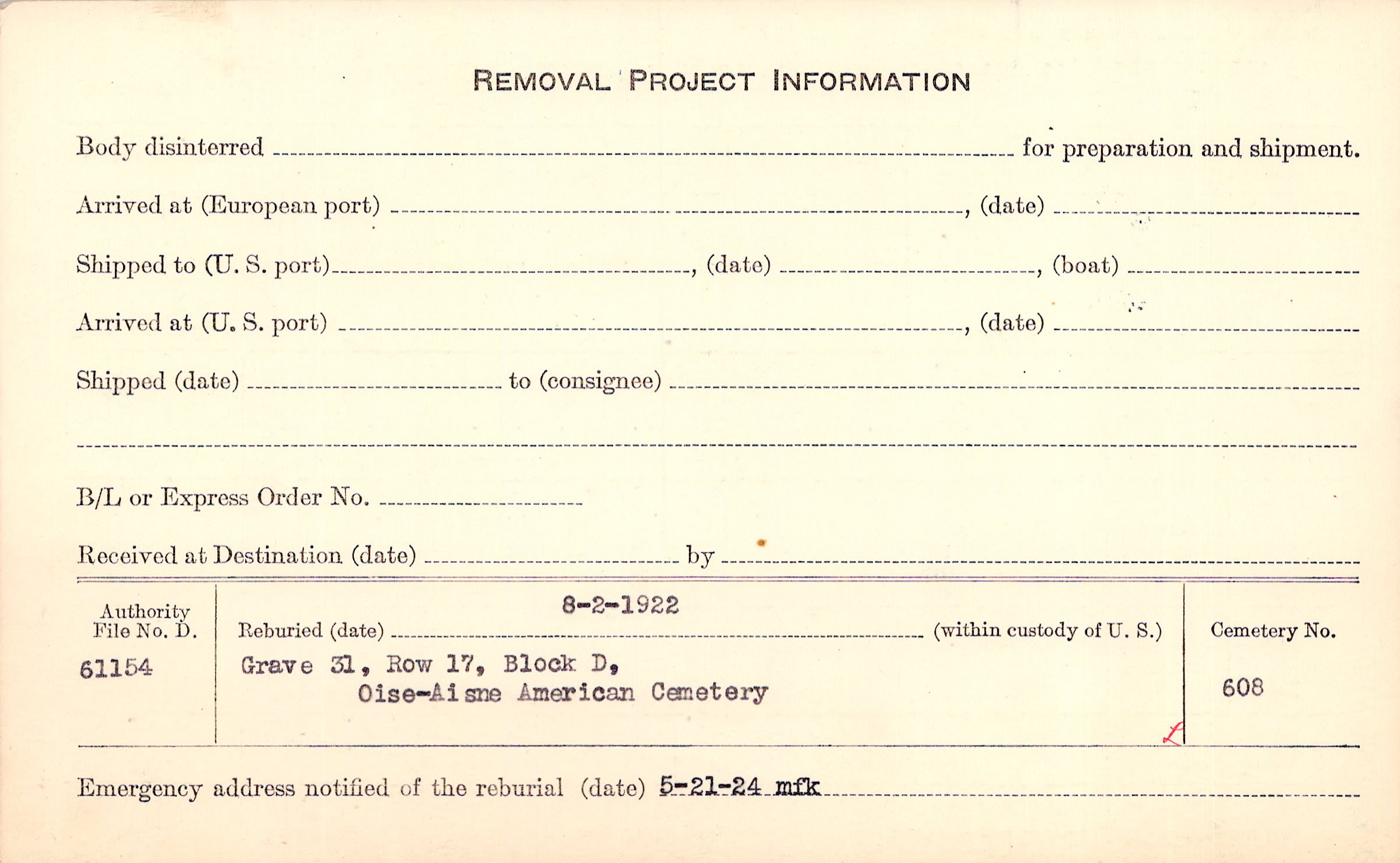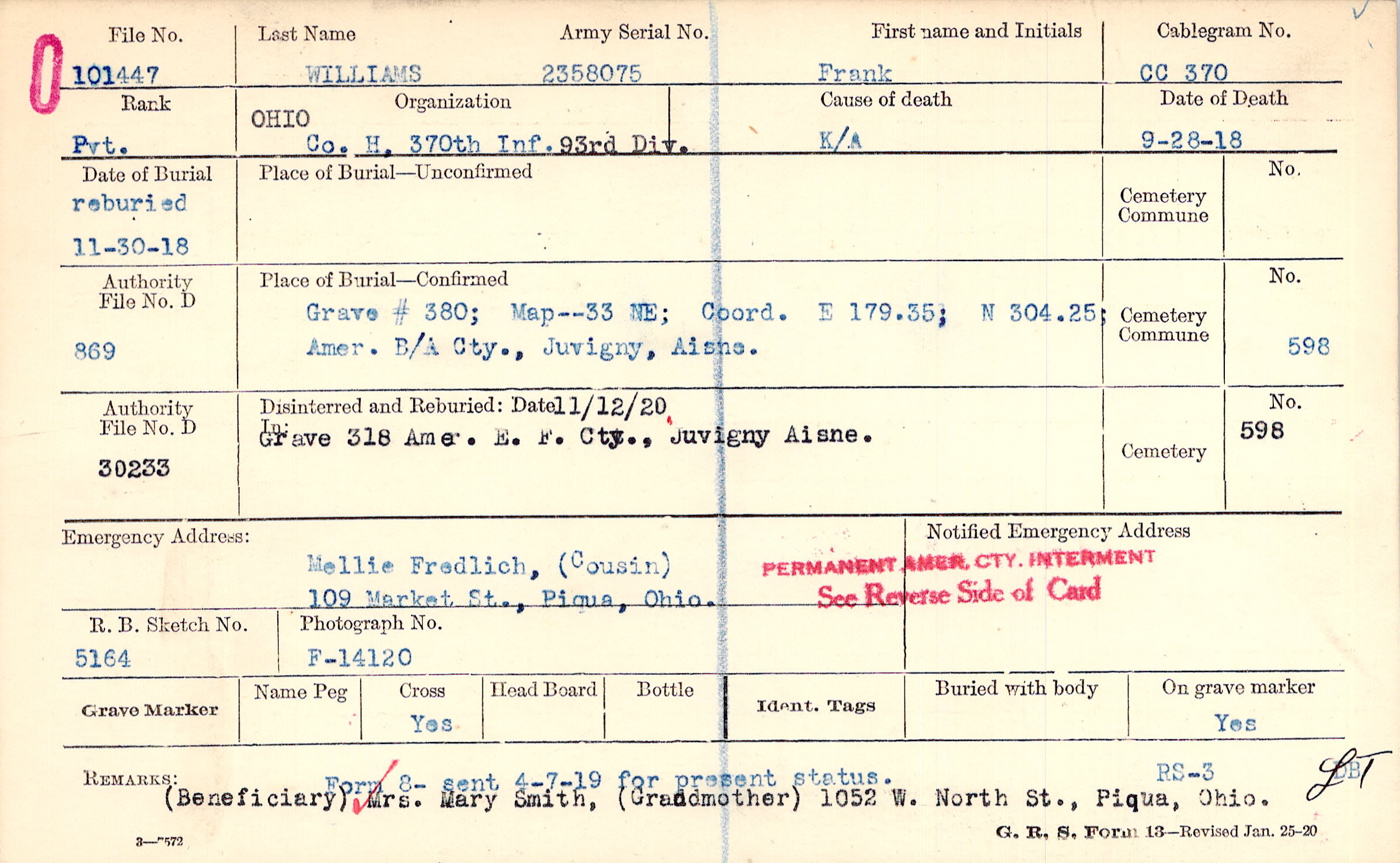 Grave #380; Map--33 NE; Coord.,Amer. B/A Cty., Juvigny, Aisne.