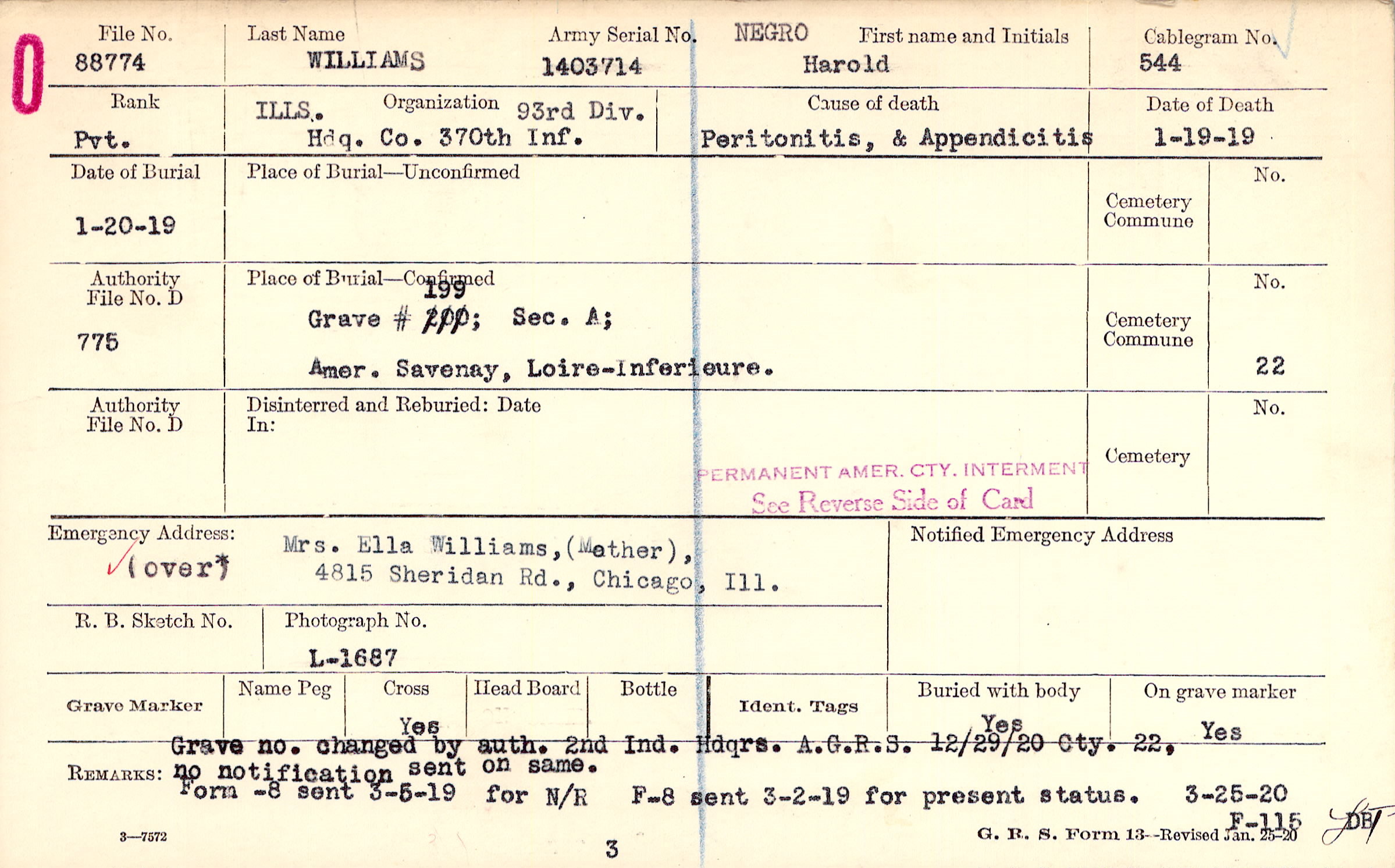 Grave no. changed by auth. 2nd Ind. Hdqrs. A.G.R.S 12/29/20 Cty. 22, no notification sent on same., Grave no. changed by auth. 2nd Inf. Hdqrs. A.G.R.S 12/29/20 Cty. 22. no notification sent on same Form -8 sent 3-5-19 for N/R F-8 sent 3-2-19 for present status, 3-25-20 F-115