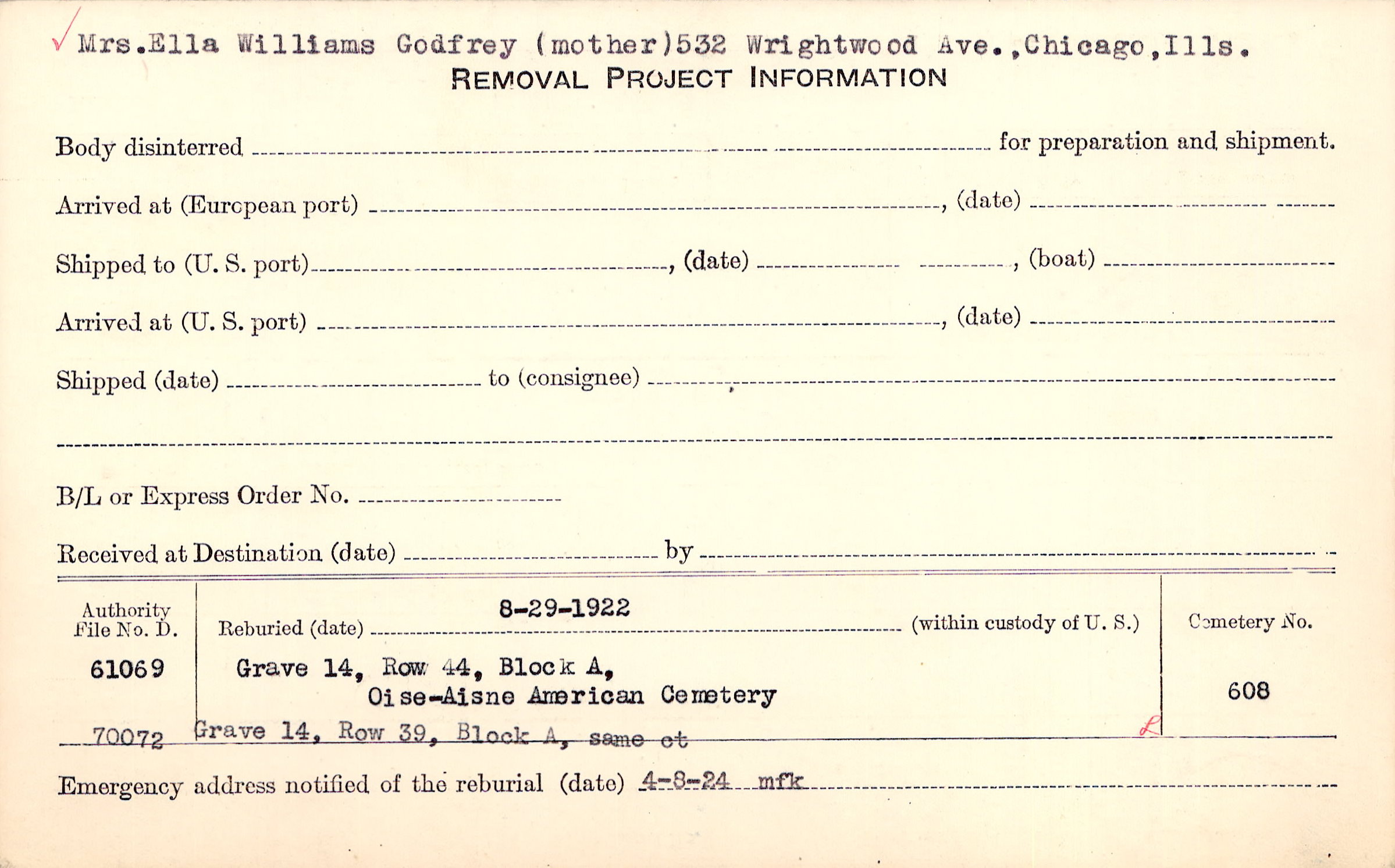 Mrs. Ella Williams Godfrey (mother), 532 Wrightwood Ave., Chicago, Ills. |