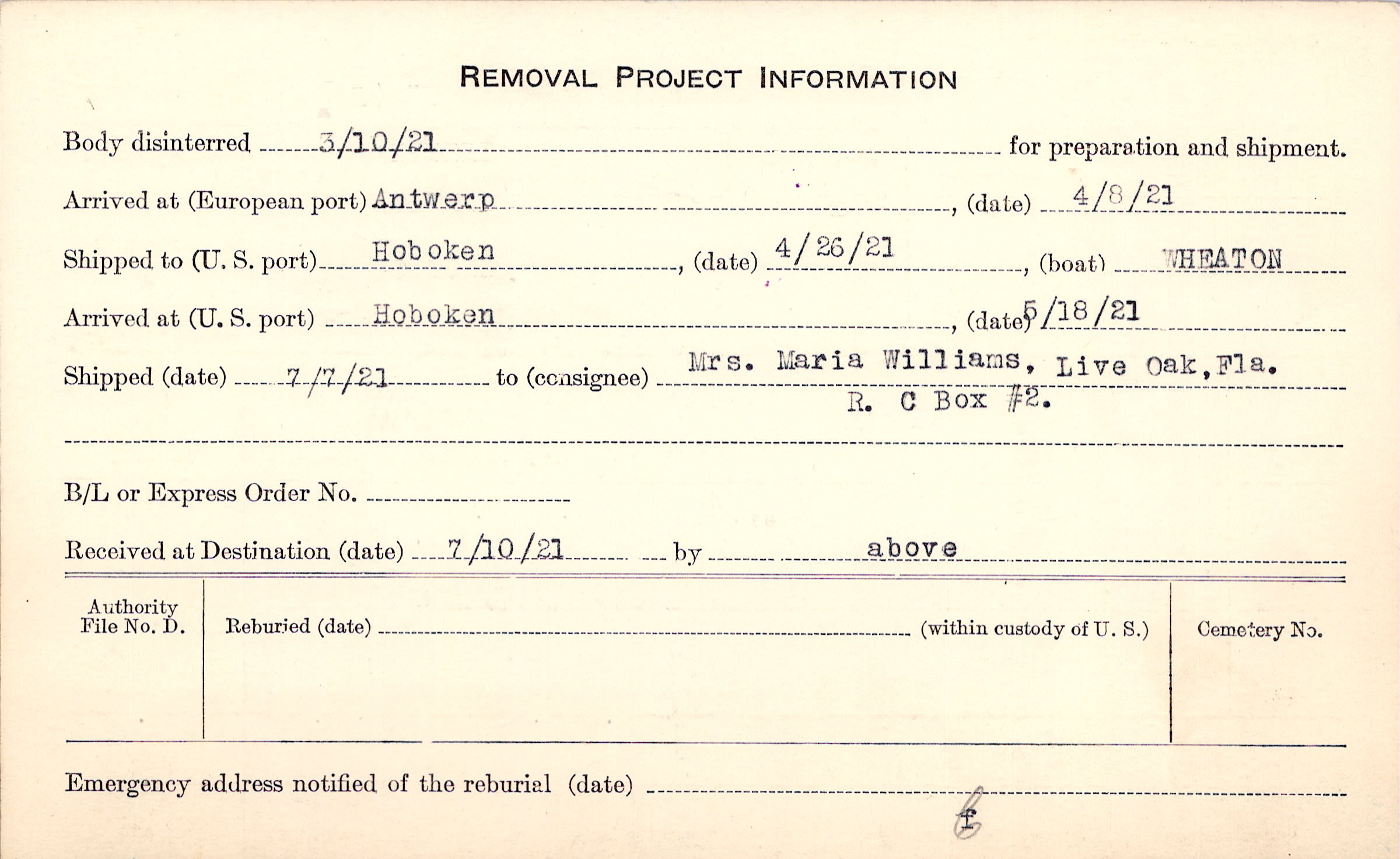 Body disinterred 3/10/1921 for preparation and shipment.