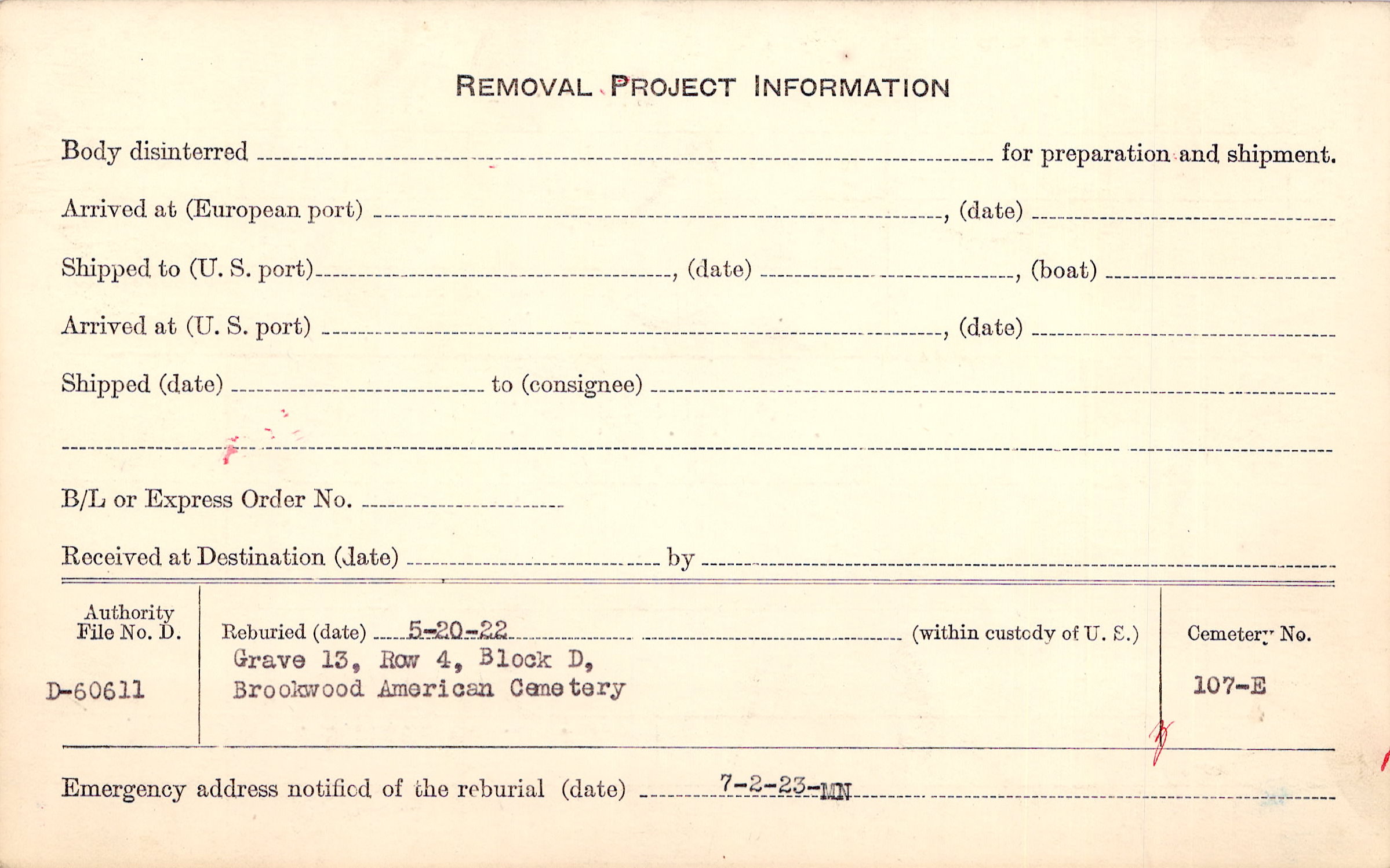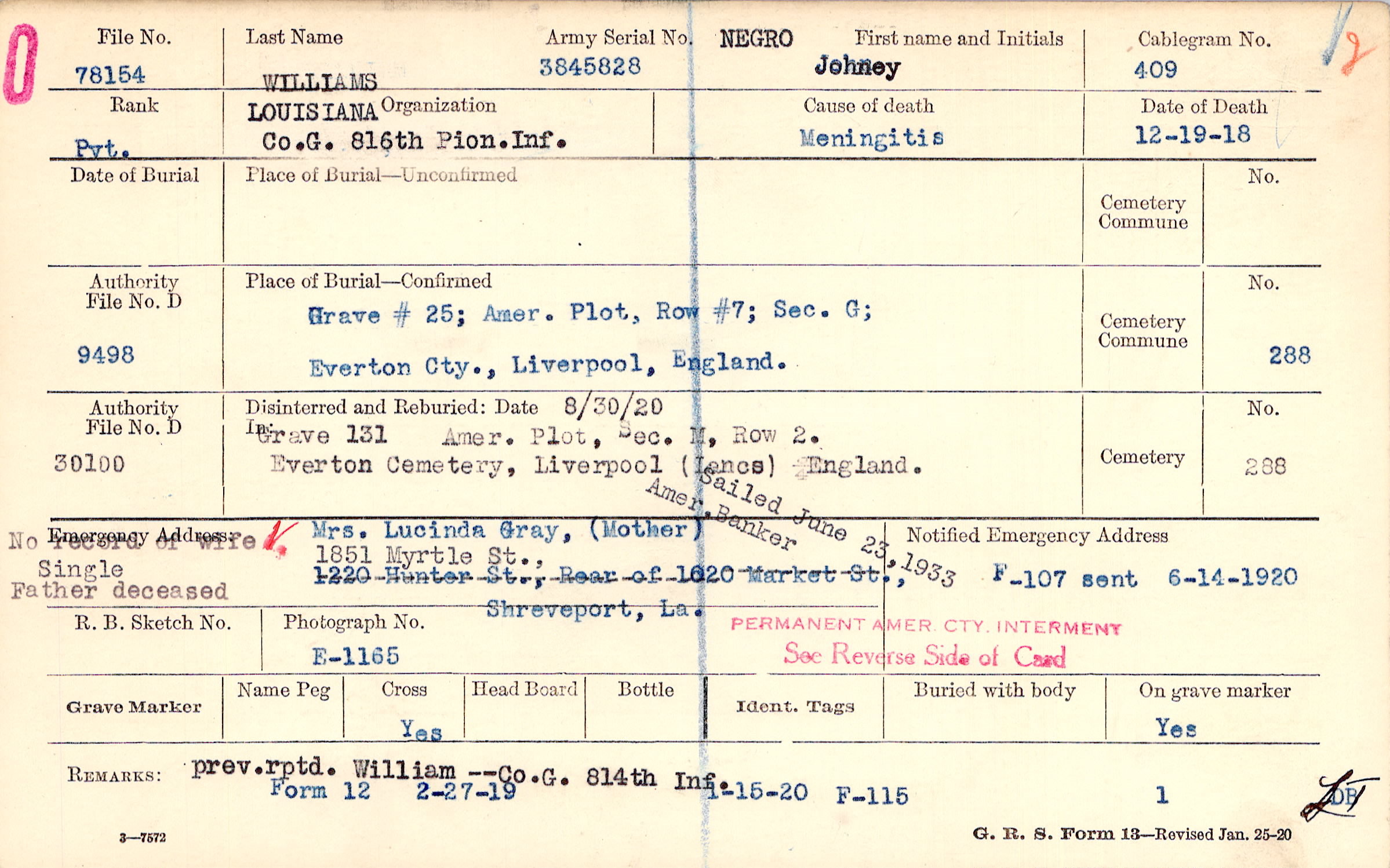 Grave #25, Amer. Plot, Row #7, Sec. G, Everton Cty., Liverpool, England.