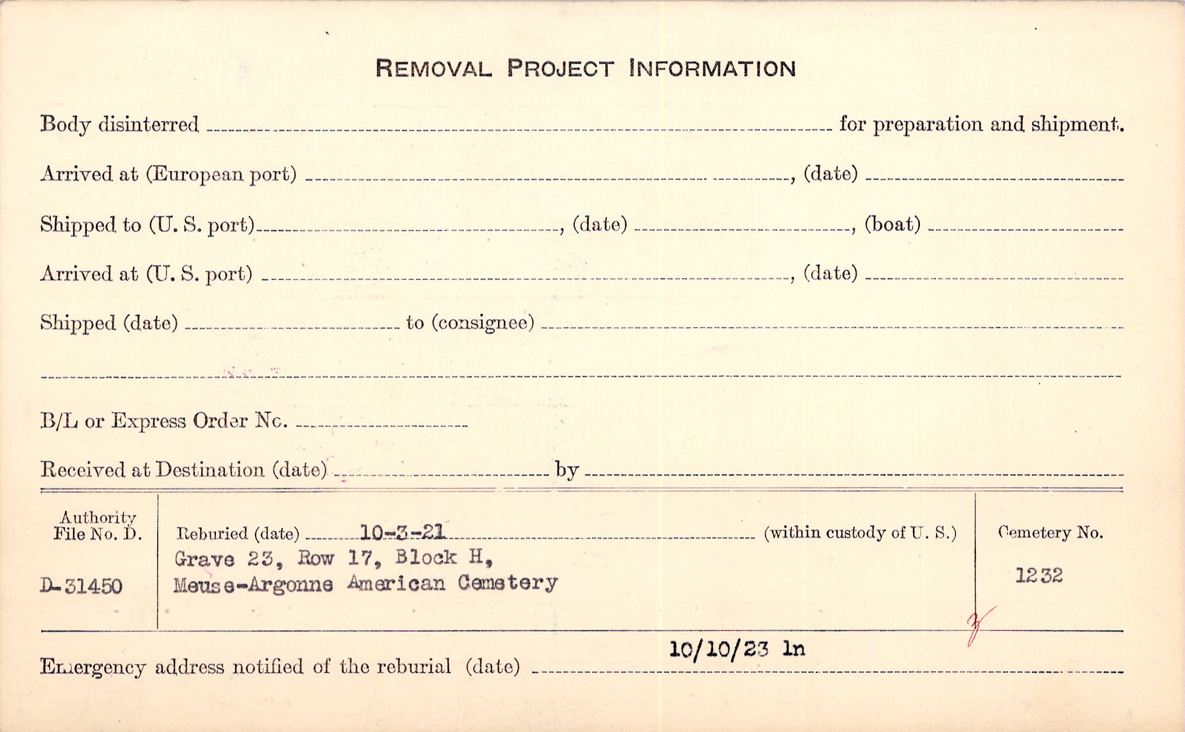 | Permanent Burial in Foreign Cemetery |