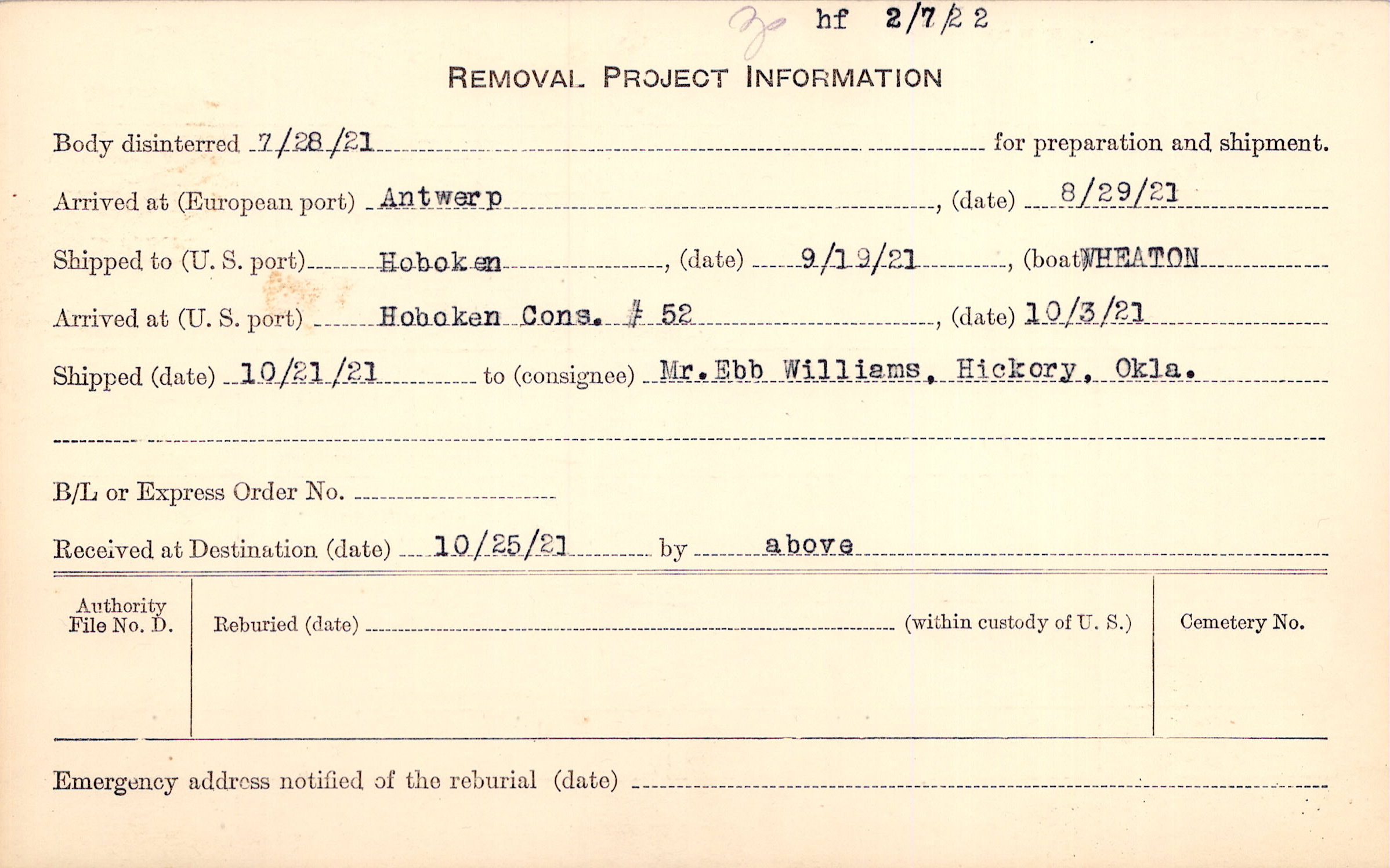 Body disinterred 7/28/1921 for preparation and shipment.