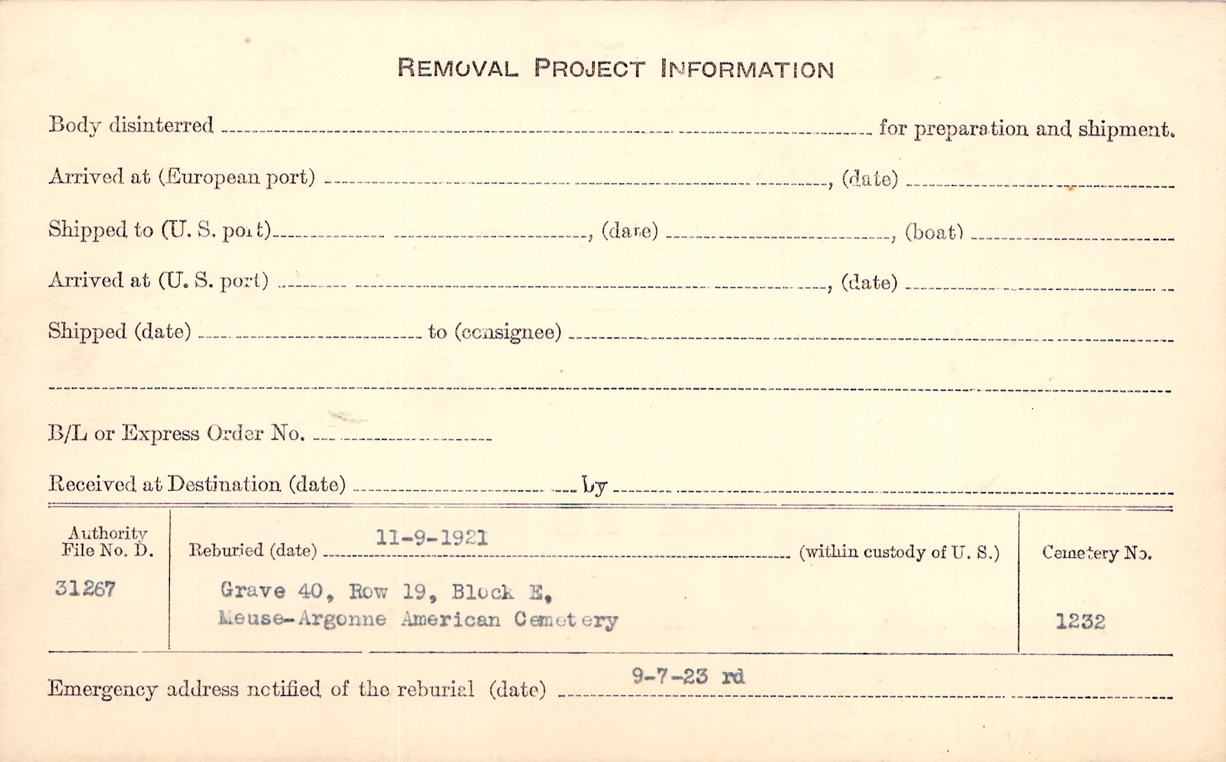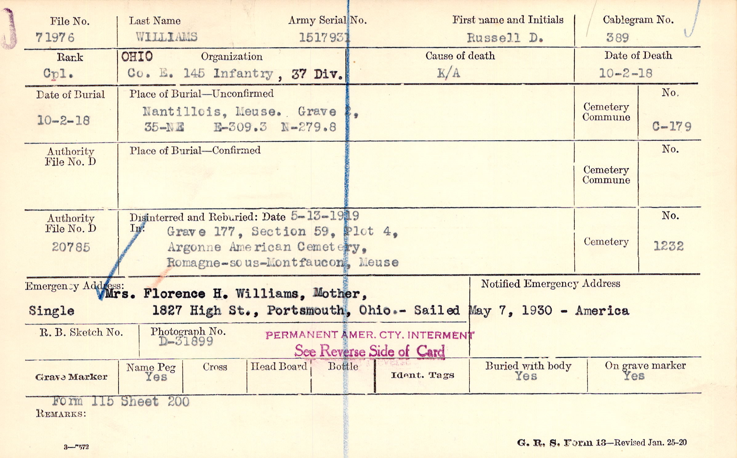 Grave 177, Section 59, Plot 4, Argonne American Cemetery, Romagne-sous-Montfaucon, Meuse