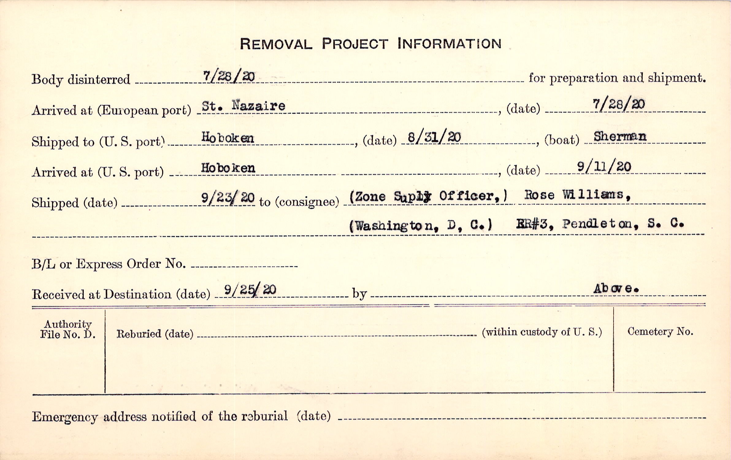 Body disinterred 7/28/1920 for preparation and shipment.
