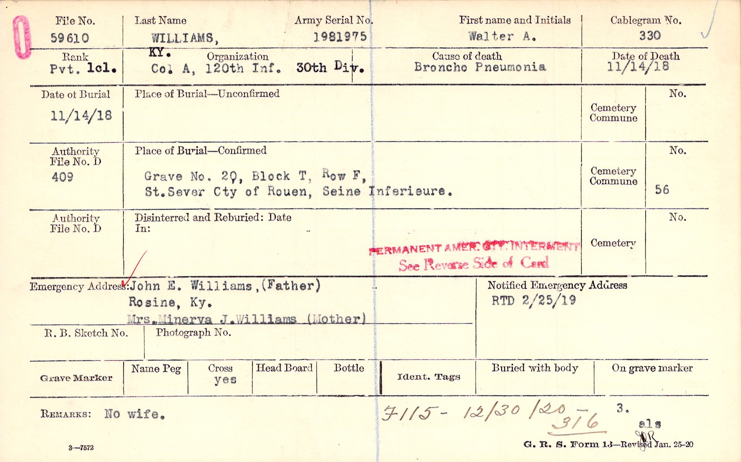 Grave 20, Block T, Row F, St. Sever Cty. of Rouen, Seine Inferieure.