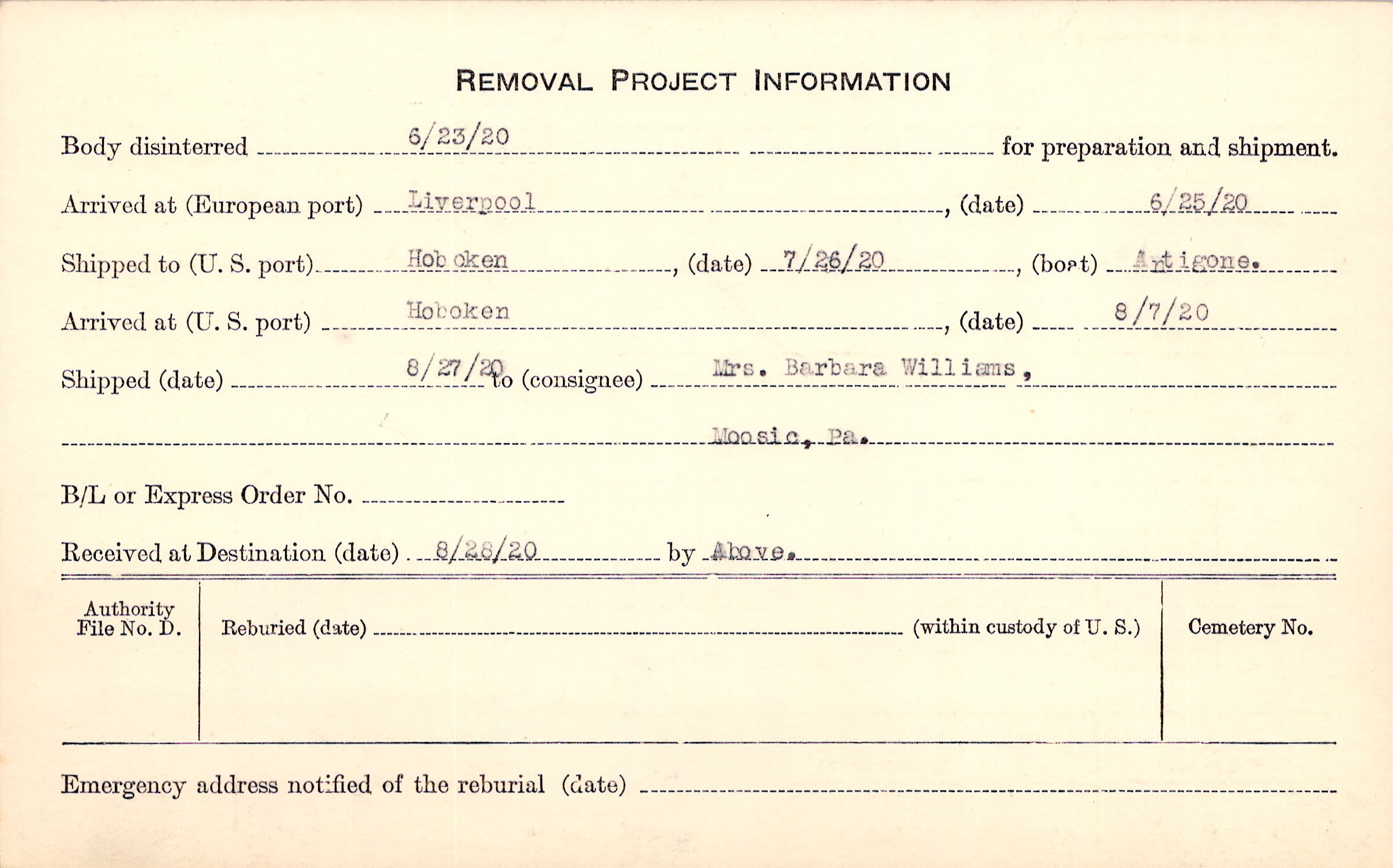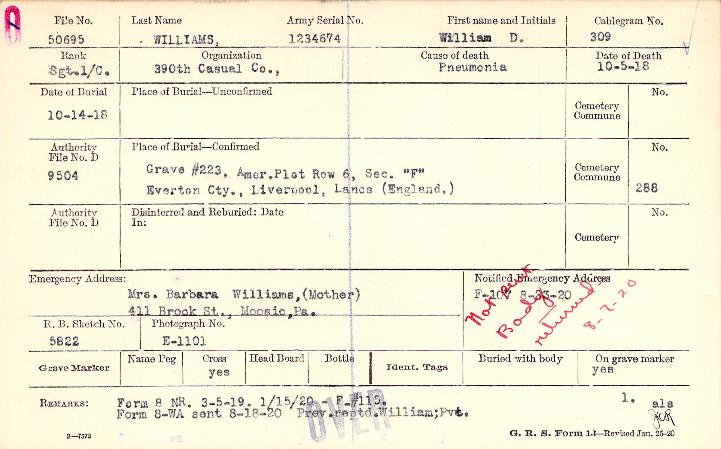 Form 107: 8/23/1920, Not sent Body returned 8/7/1920