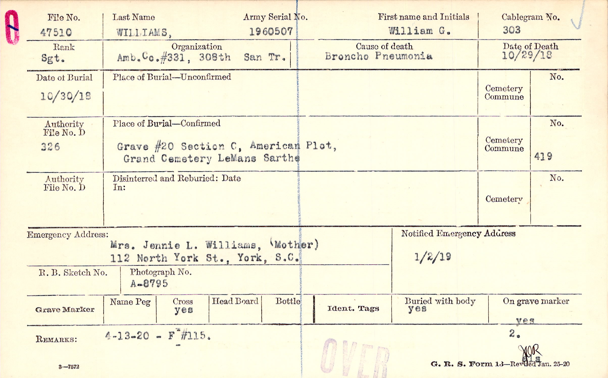 Grave #20, Section C, American Plot, Grand Cemetery, LeMans, Sarthe