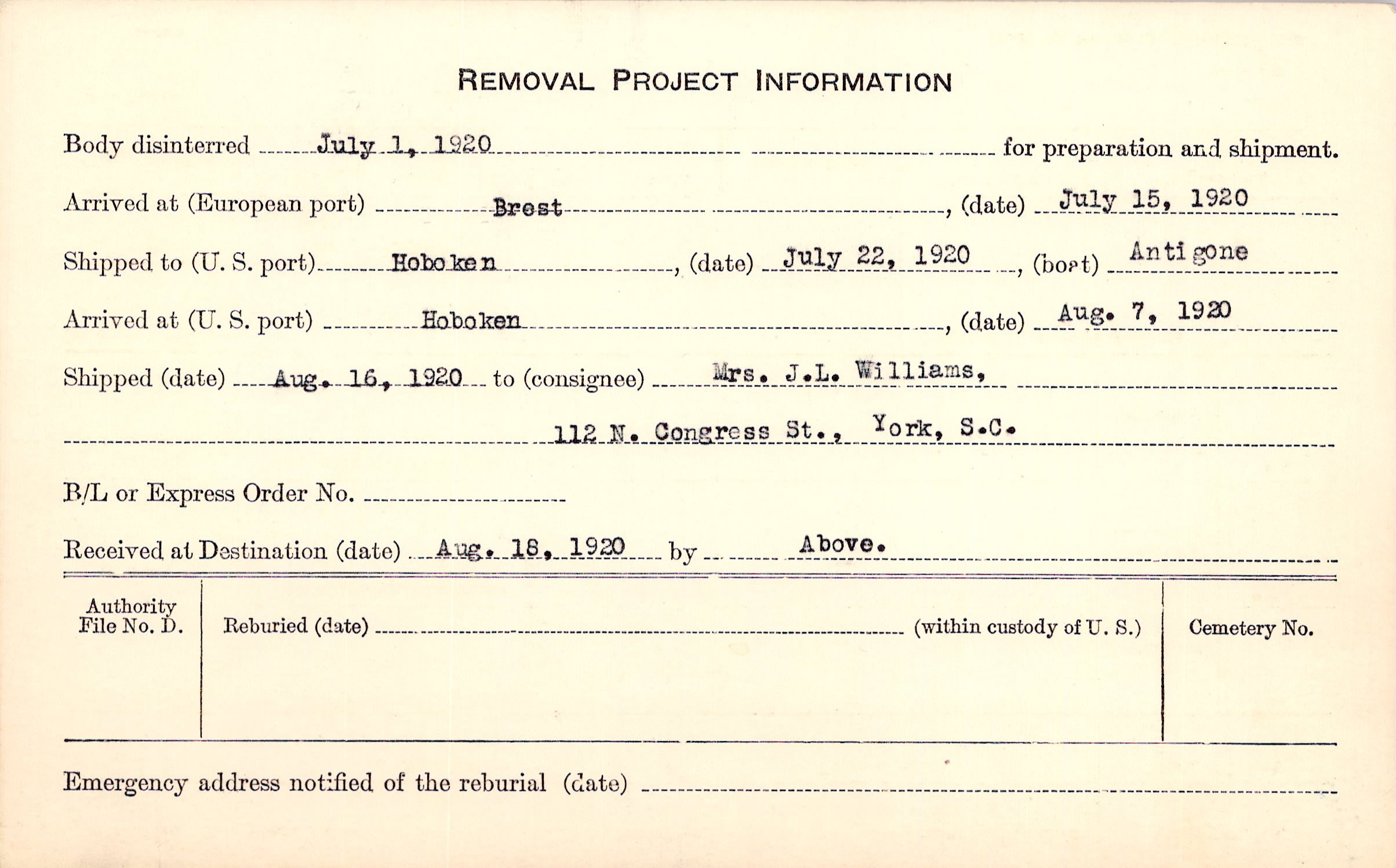 Body disinterred 7/1/1920 for preparation and shipment.