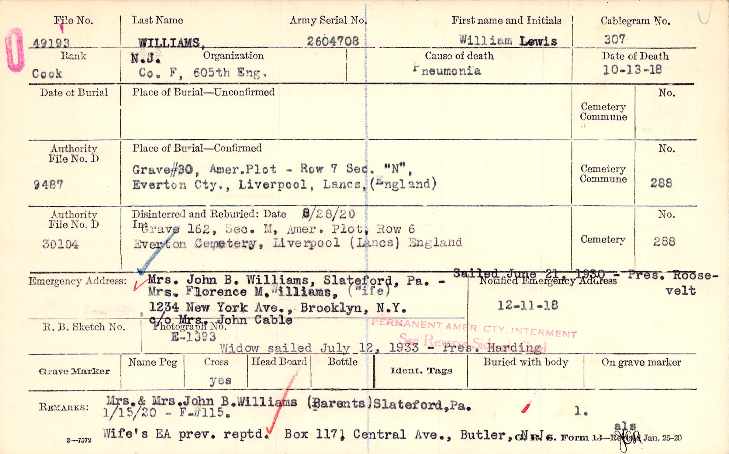 Mrs. Florence M. Williams, (Wife), 1234 New York Ave., Brooklyn, N.Y, c/o Mrs. John Cable, c/o Mrs. John Cable Mrs. John B. Williams, Slateford, Pa-Sailed June 21, 1930-Pres. Roosevelt Widow sailed July 12, 1933-Pres. Harding