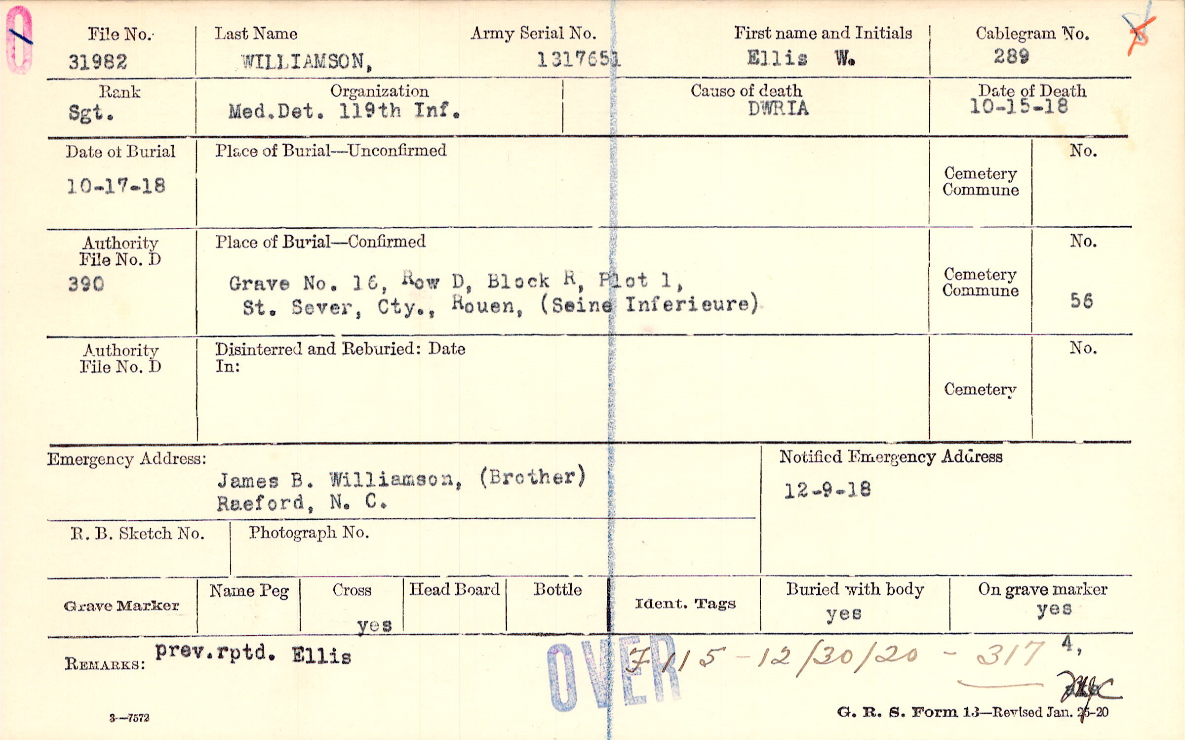 Grave 16, Row D, Block R, Plot 1, St. Sever, Cty., Rouen, Seine Inferieure