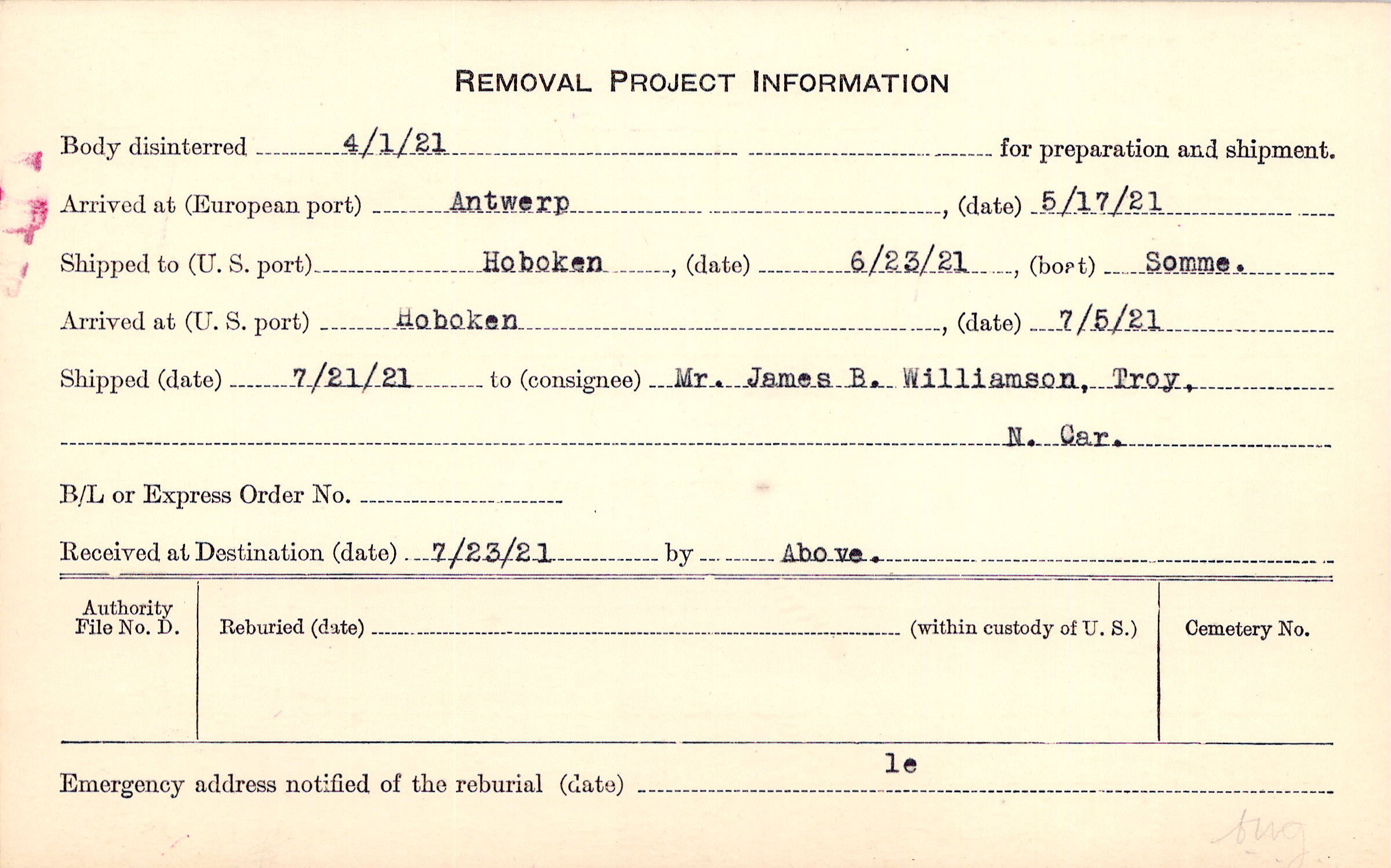 Body disinterred 4/1/1921 for preparation and shipment.