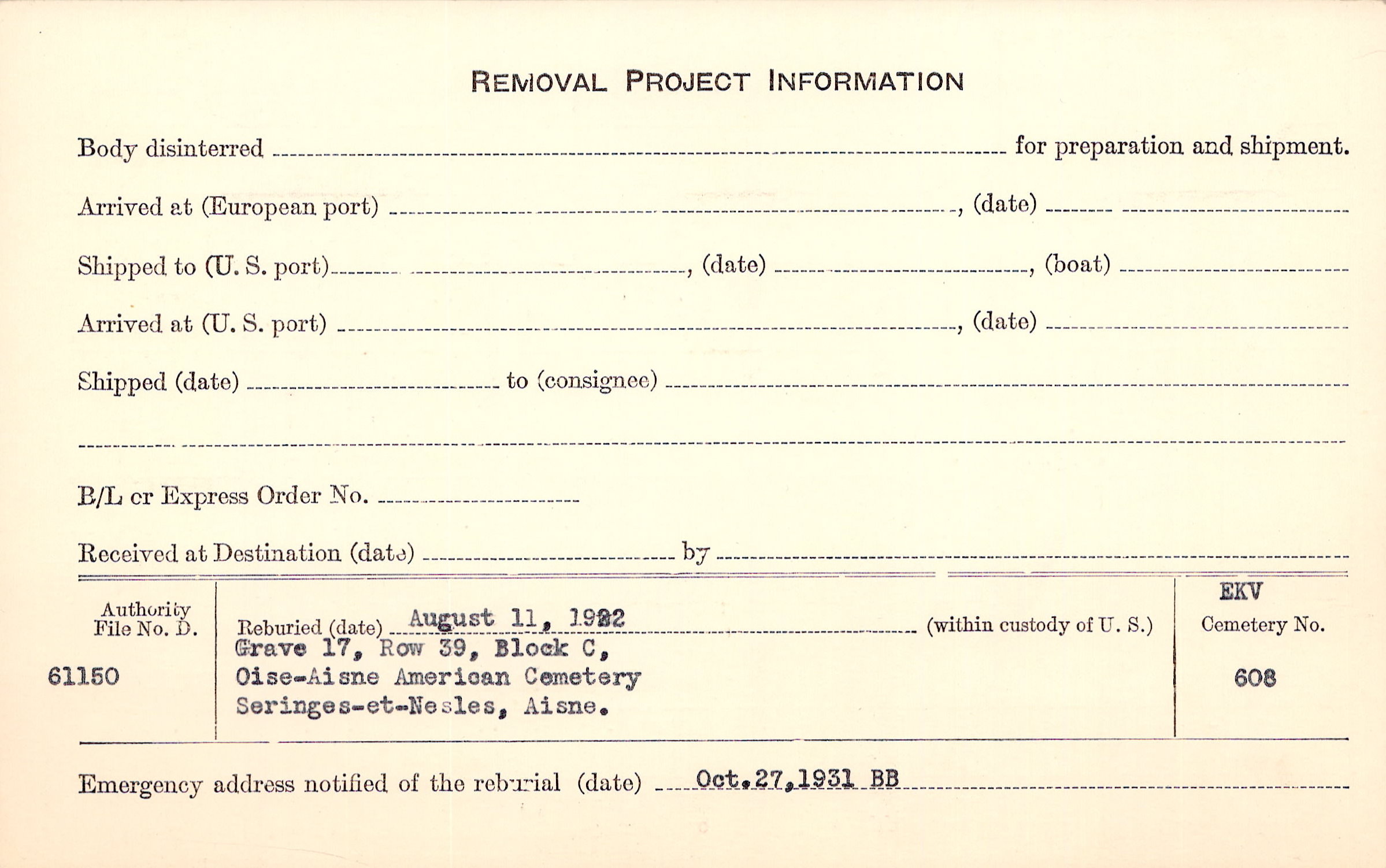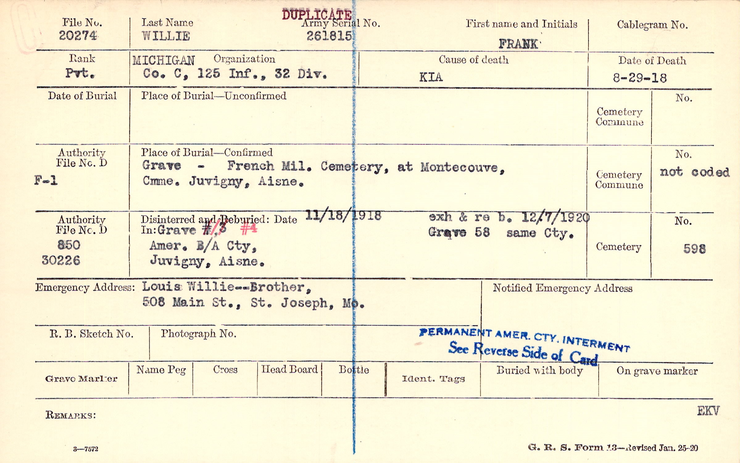 Grave -, French Mil. Cemetery, at Montecouve, Cmme. Juvigny, Aisne.