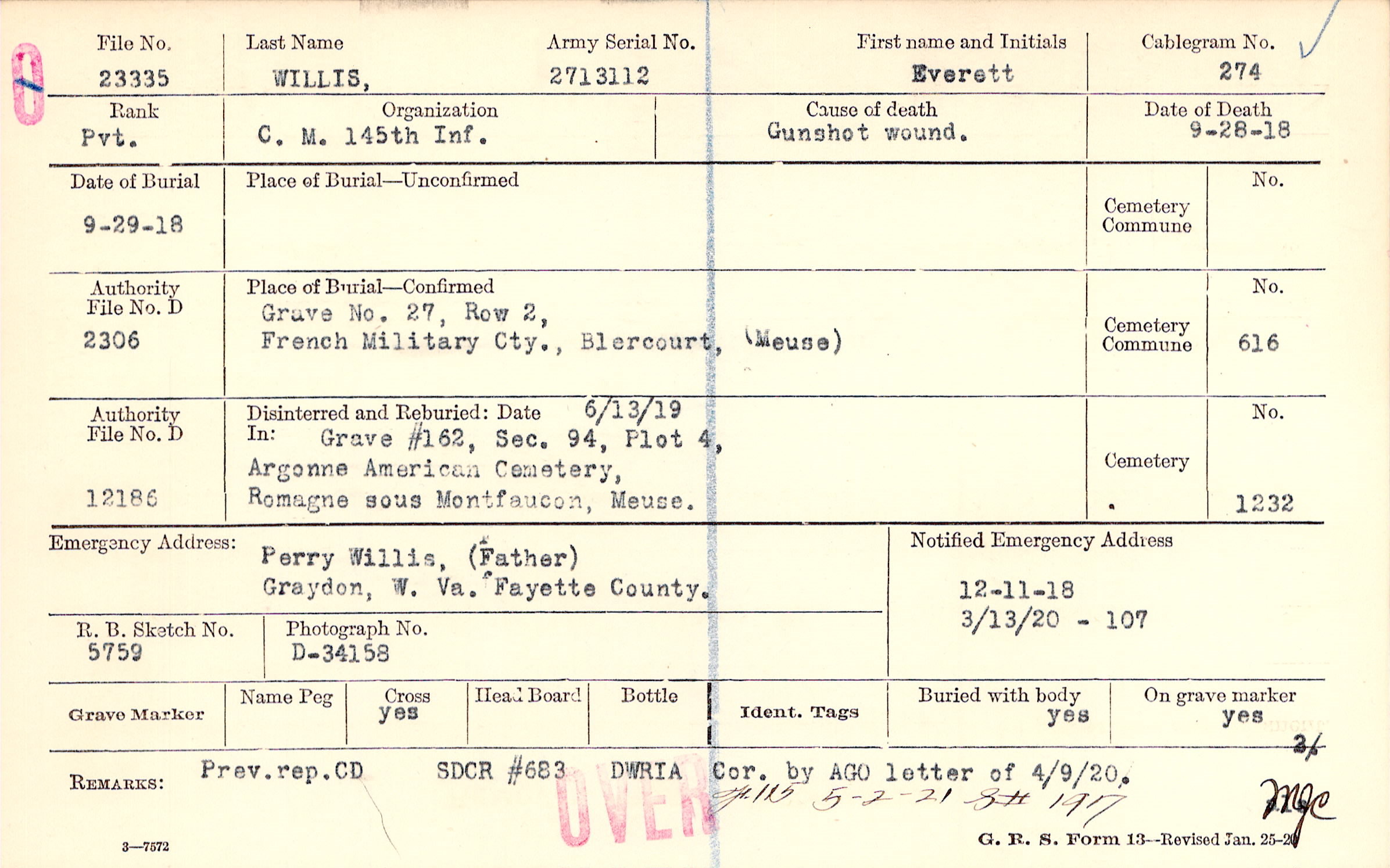 Perry Willis, (Father), Graydon, W. Va. Fayette County.