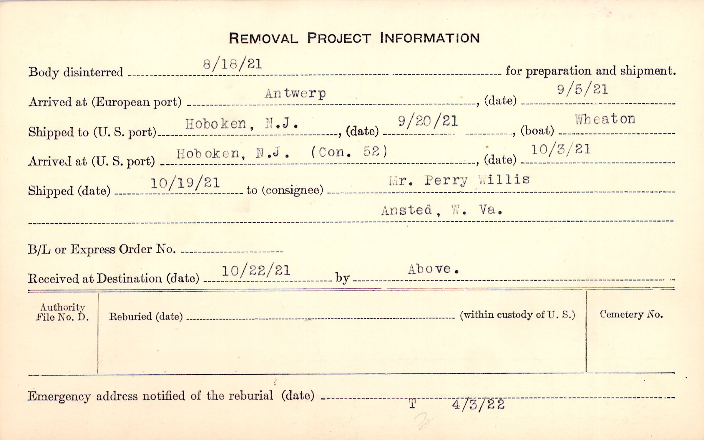 Body disinterred 8/18/1921 for preparation and shipment.