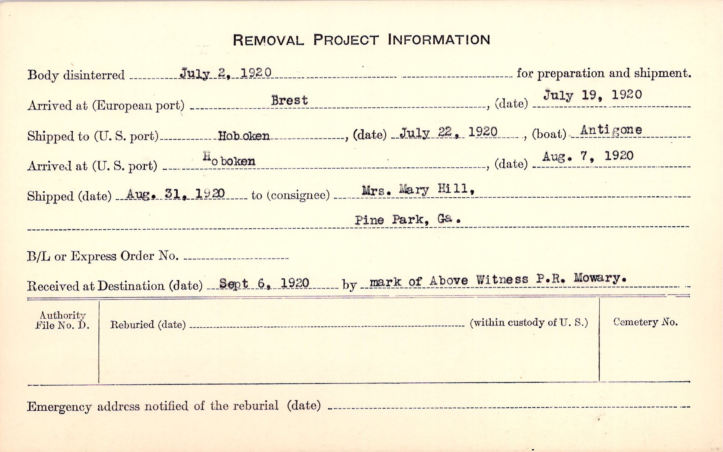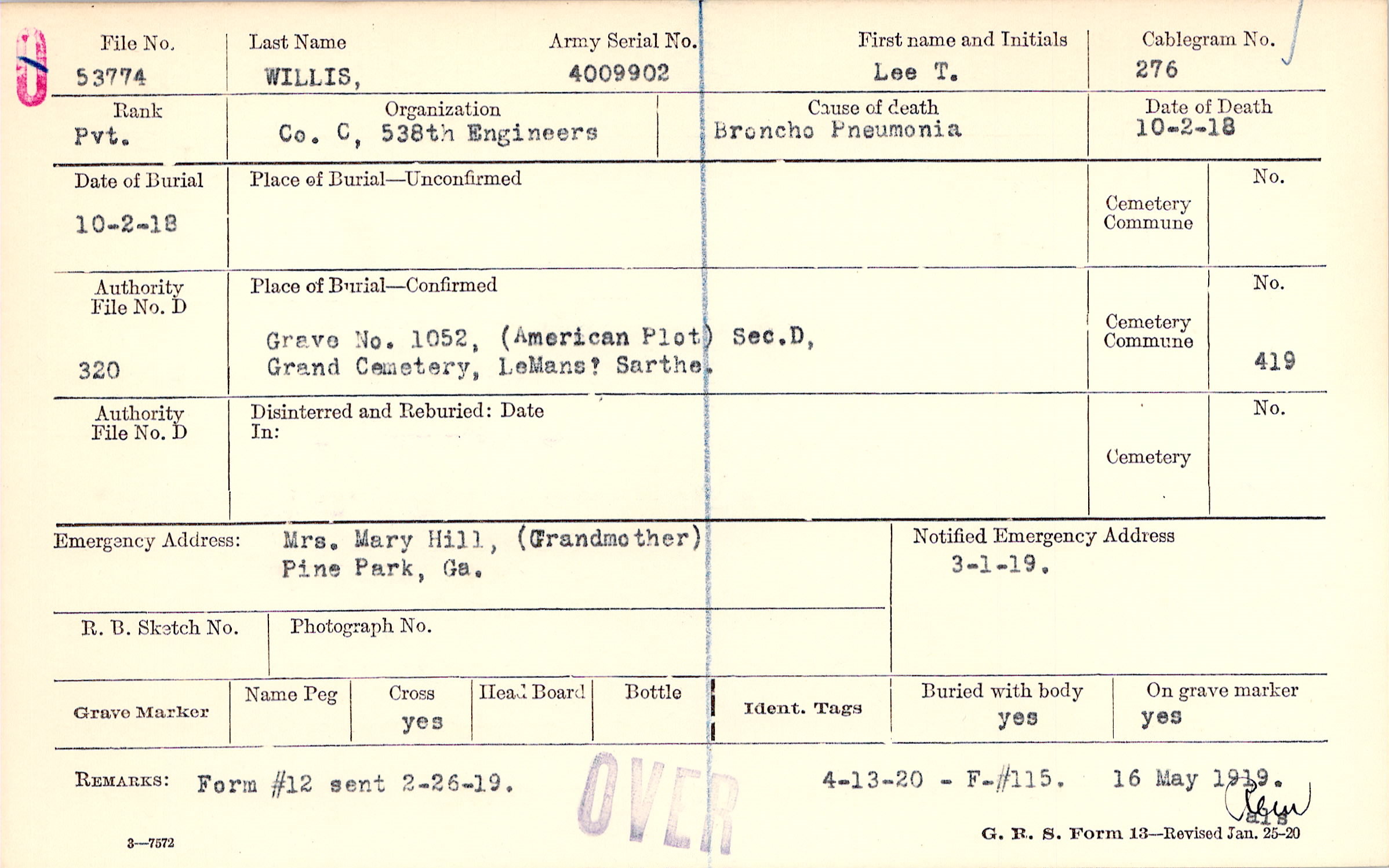 Grave 1052, American Plot, Sec. D,Grand Cemetery, LeMans, Sarthe.