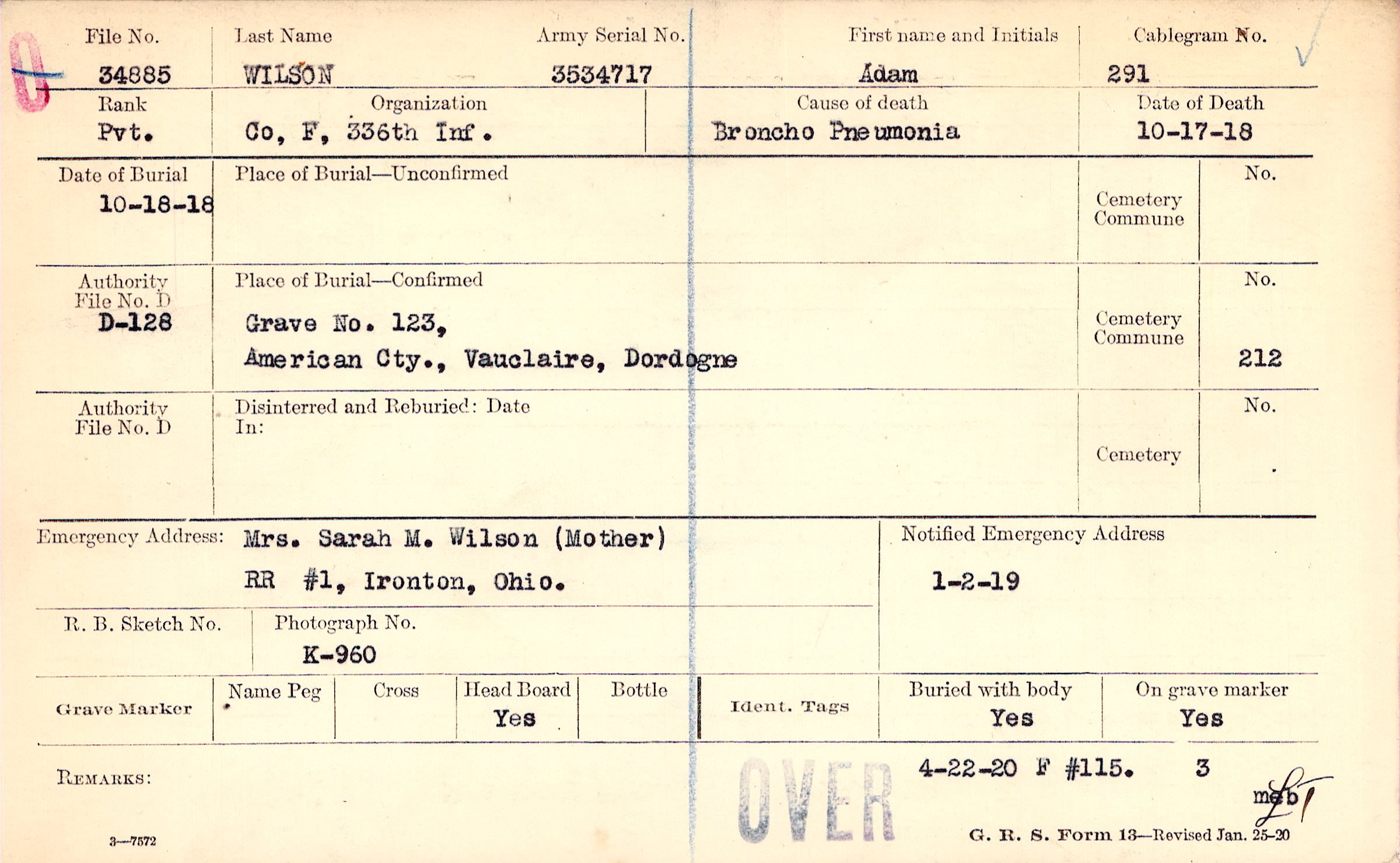 Mrs. Sarah M. Wilson (Mother), RR #1, Ironton, Ohio