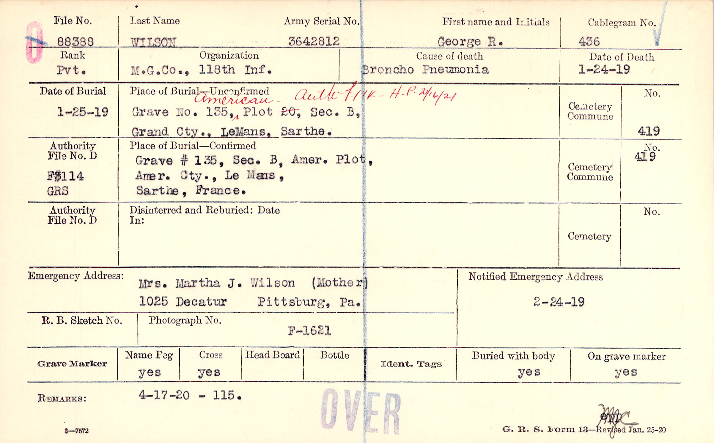 American -auth (unclear)- H.P. 21/16/21, Grave No 135, Plot (crossed out) 20, Sec. B, Grand Cty, LeMans, Sarthe