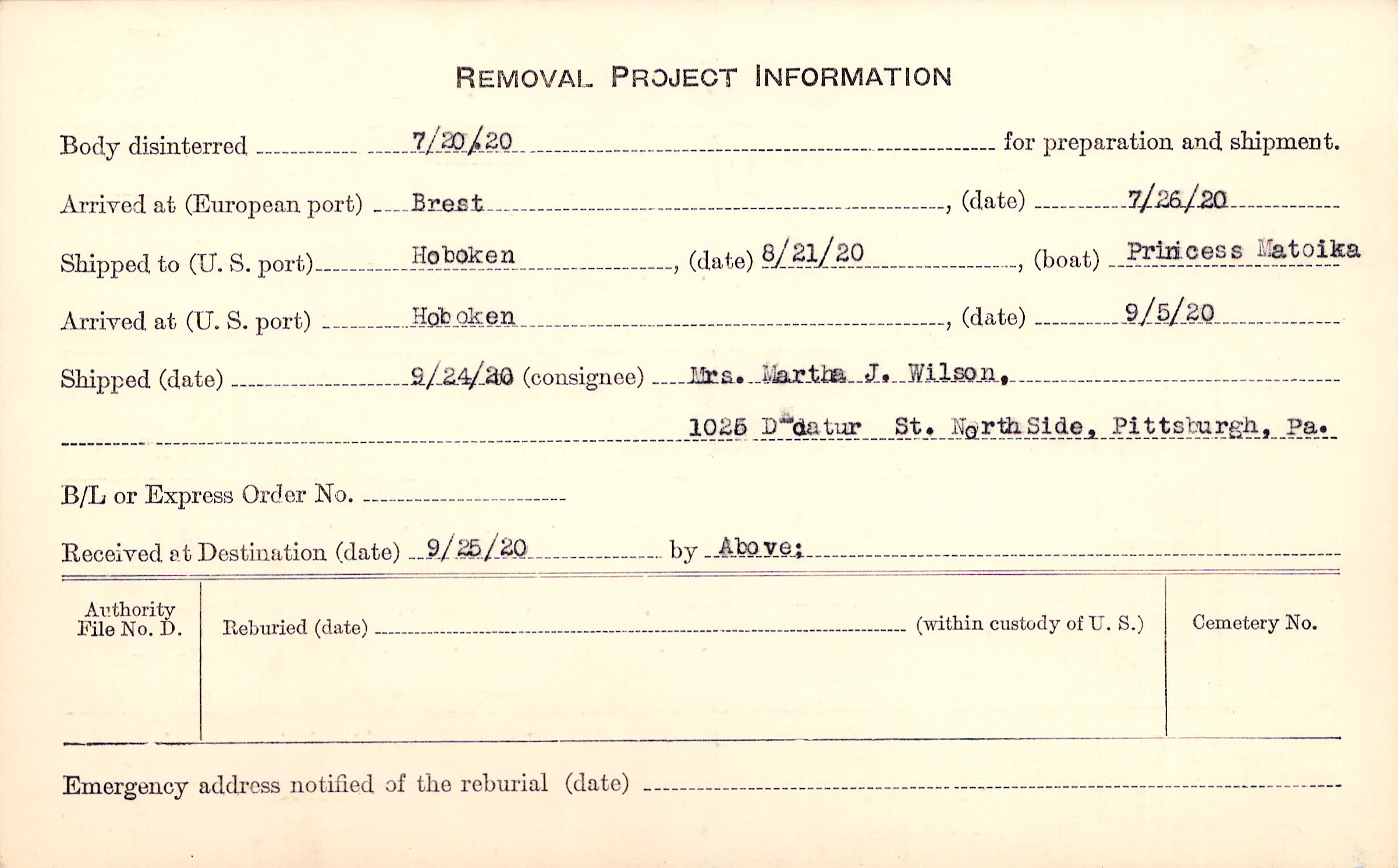Mrs. Martha J. Wilson (Mother), 1025 Decatur Pittsburg, Pa.