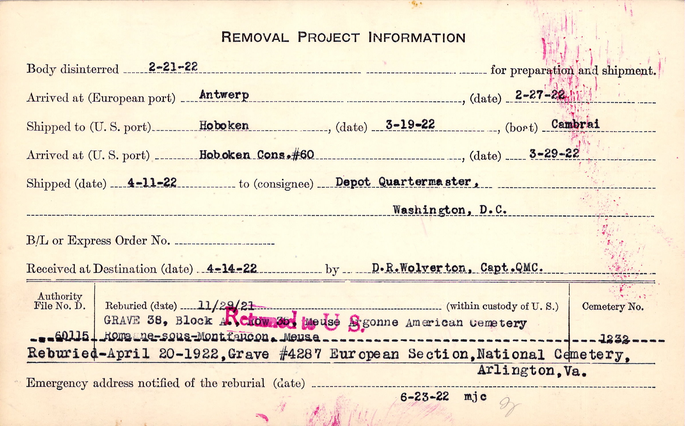 Body disinterred 2/21/1922 for preparation and shipment.