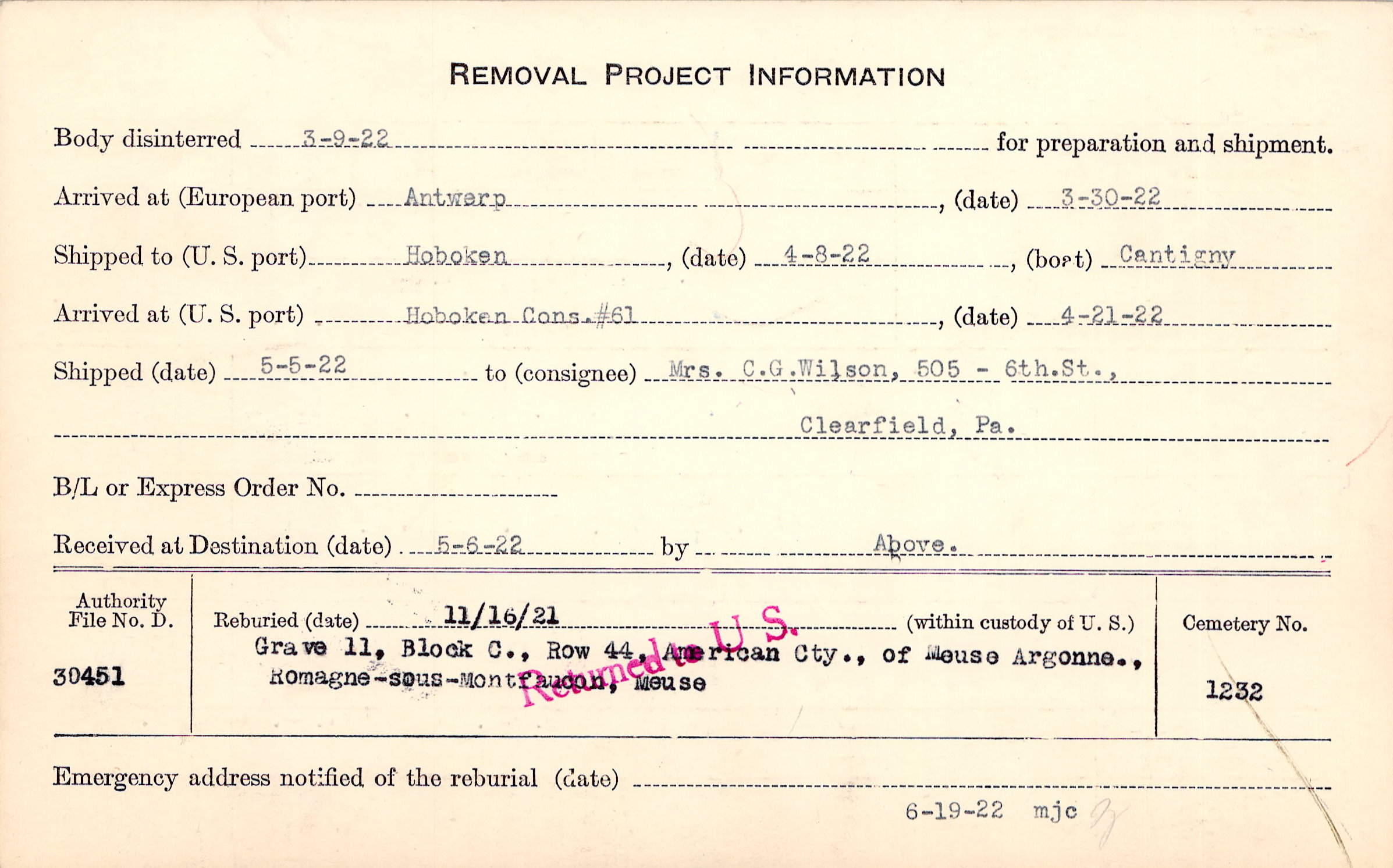 Body disinterred 3/9/1922 for preparation and shipment.