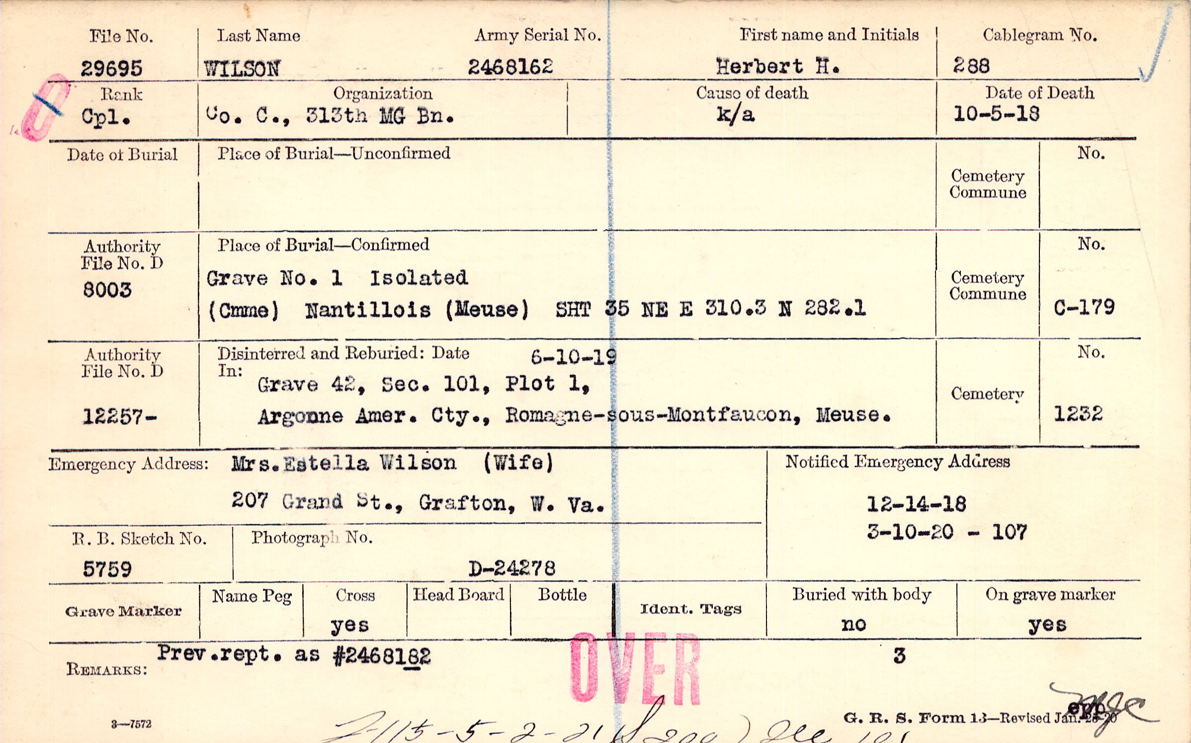 Mrs. Estella Wilson (Wife), 207 Grand St., Grafton, W. Va.
