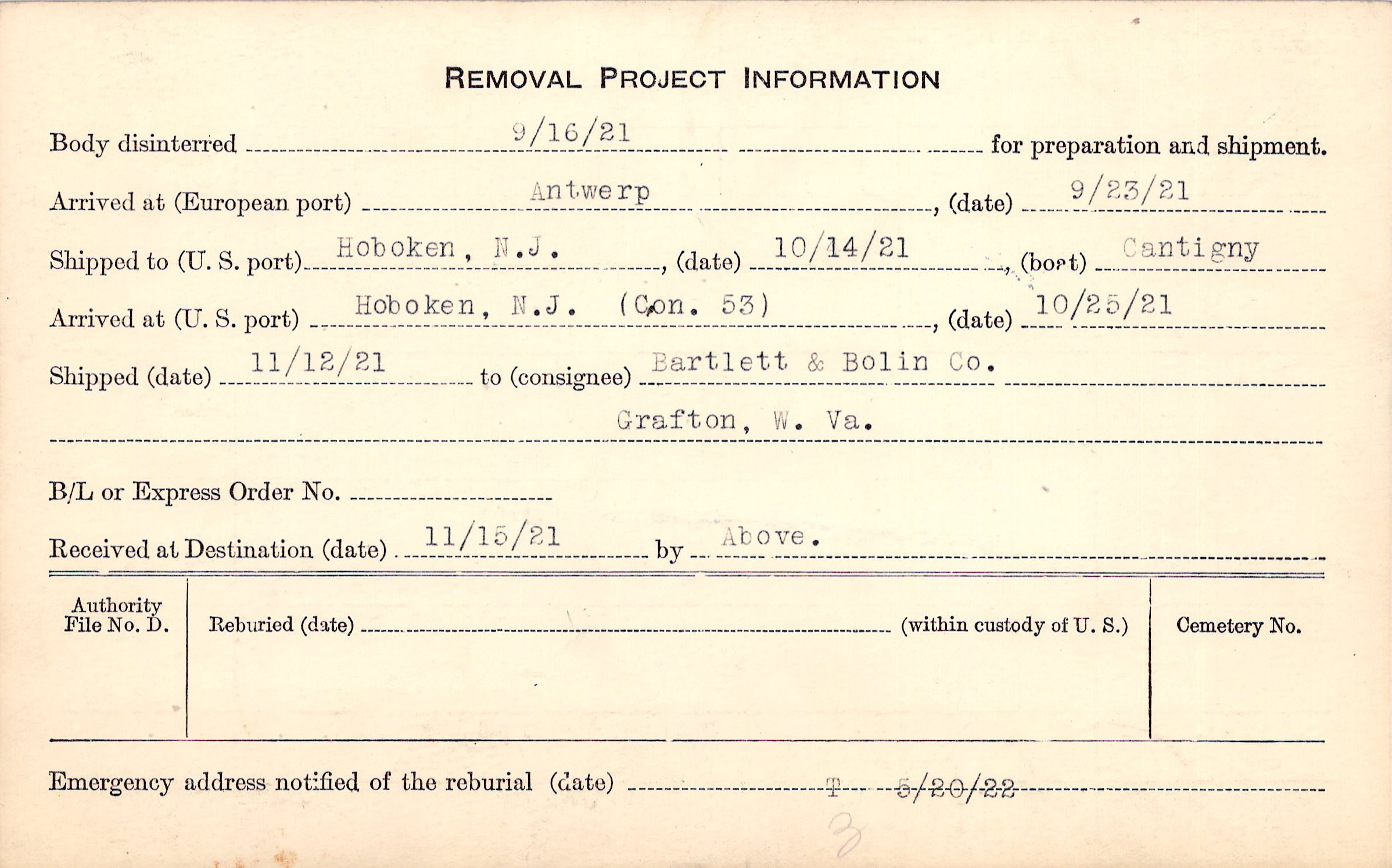Body disinterred 9/16/1921 for preparation and shipment.