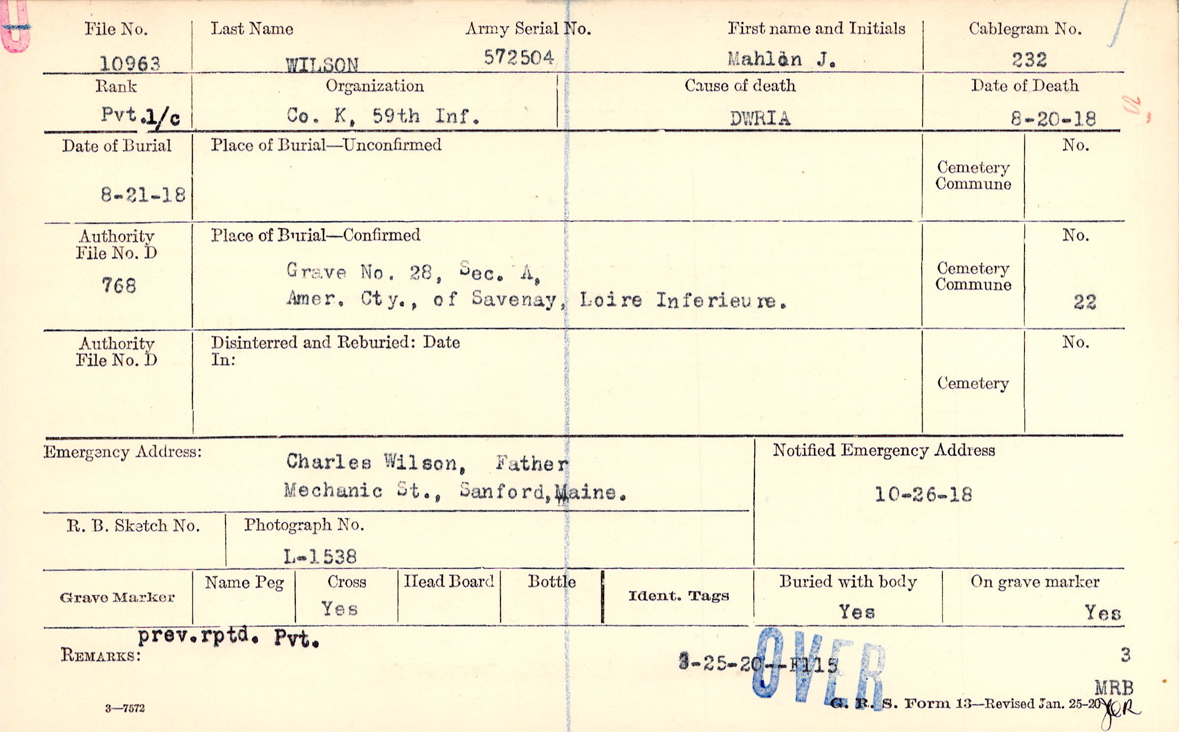 Grave 28, Sec. A, Amer. Cty., of Savenay, Loire Inferieure.