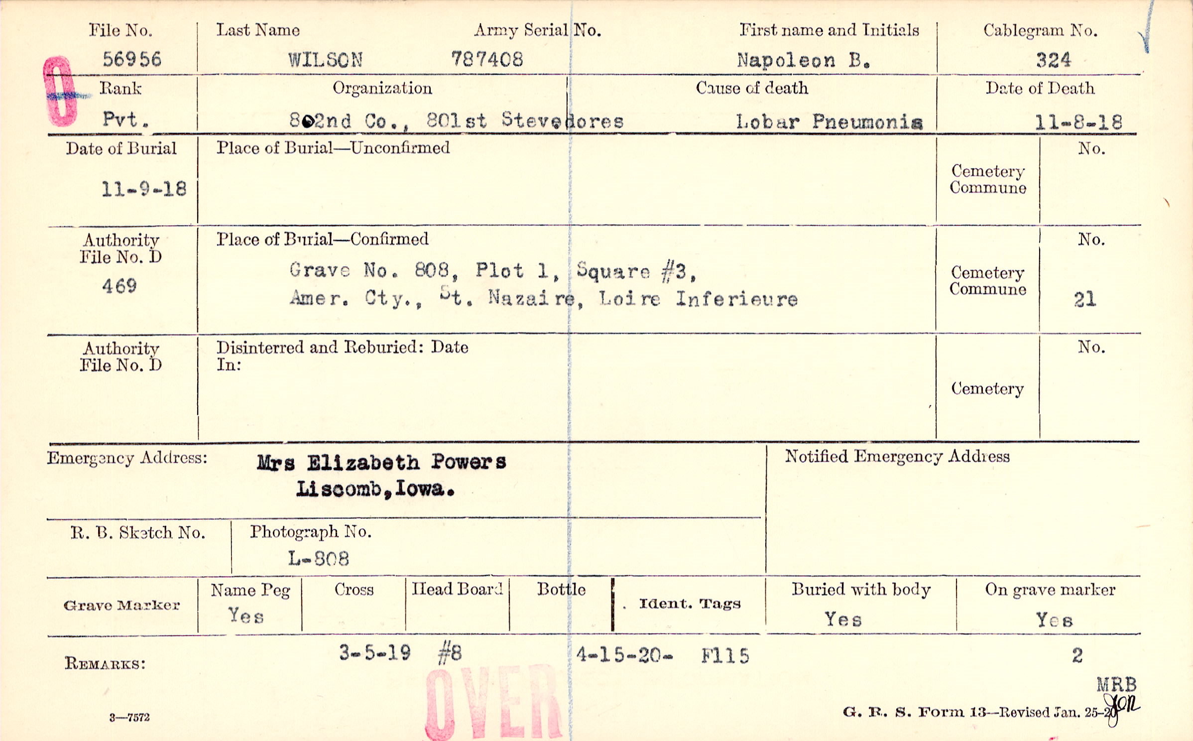Grave 808, Plot 1, Square #3, Amer. Cty., St. Nazaire, Loire Inferieure