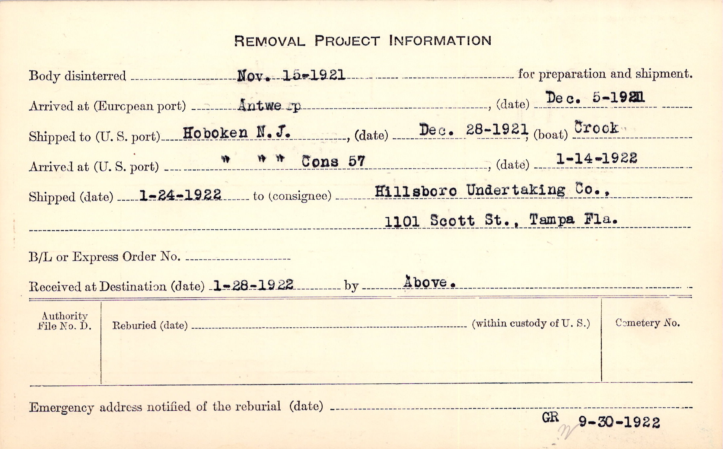 Body disinterred 11/15/1921 for preparation and shipment.