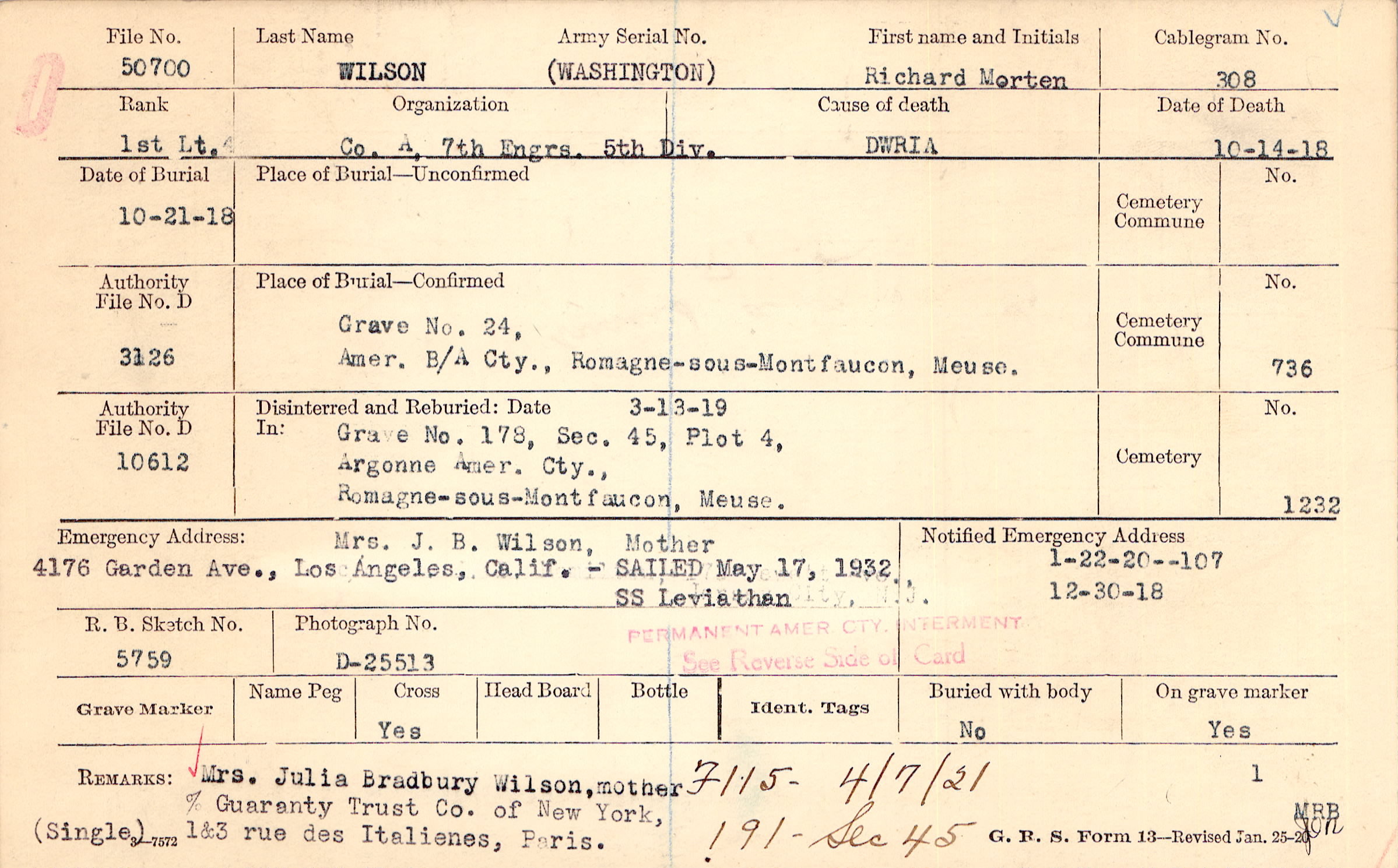 Mrs. Julia Bradbury Wilson, mother % Guaranty Trust Co. of New York, 1&3 rue des Italienes, Paris. (Single)