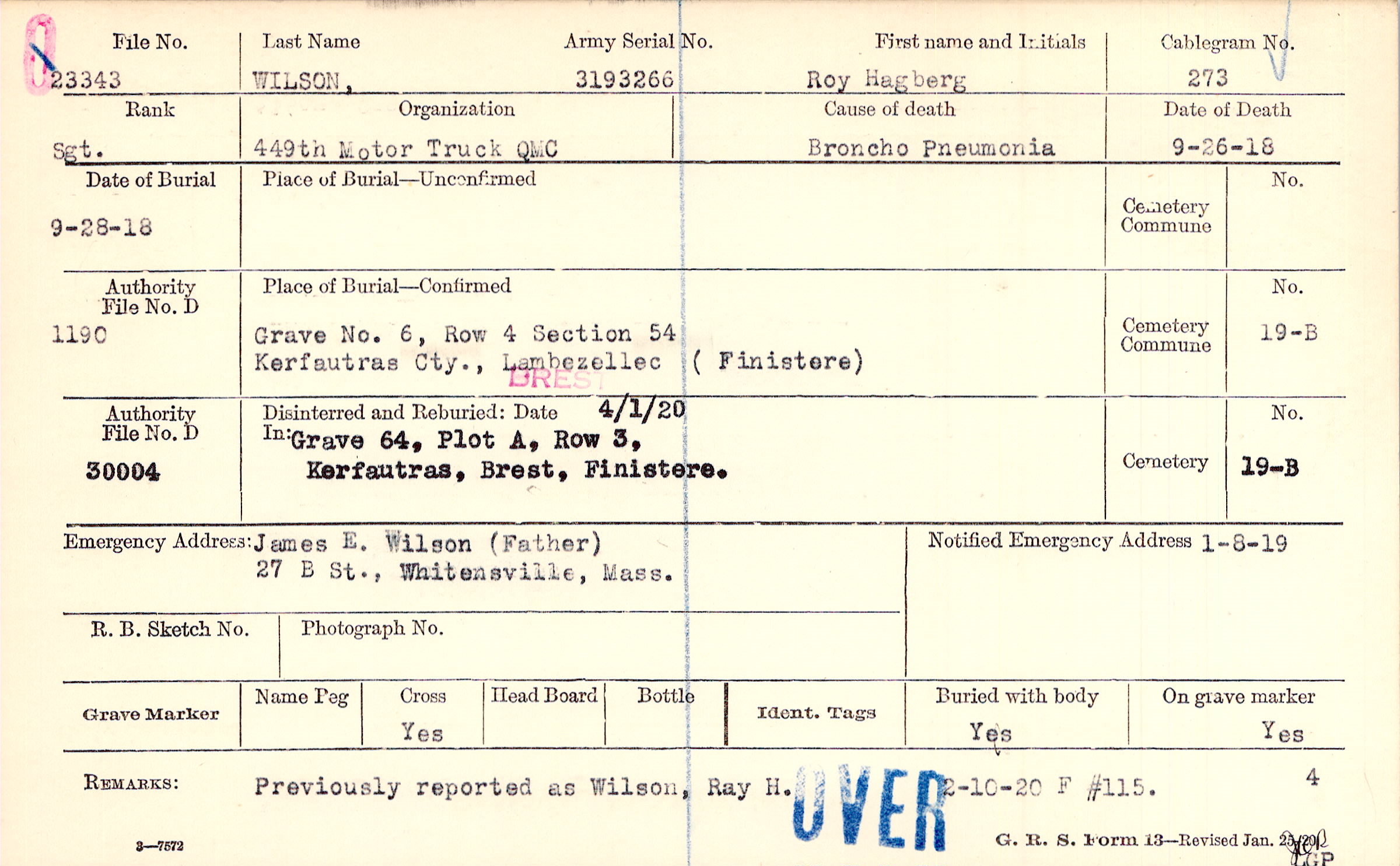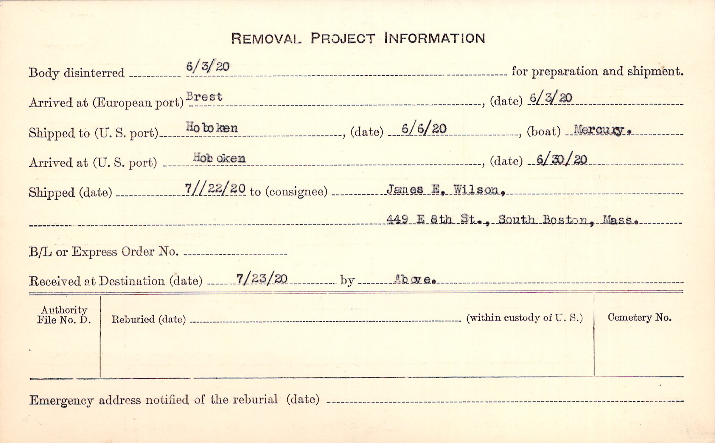 James E. Wilson (Father), 27 B St., Whitensville, Mass.