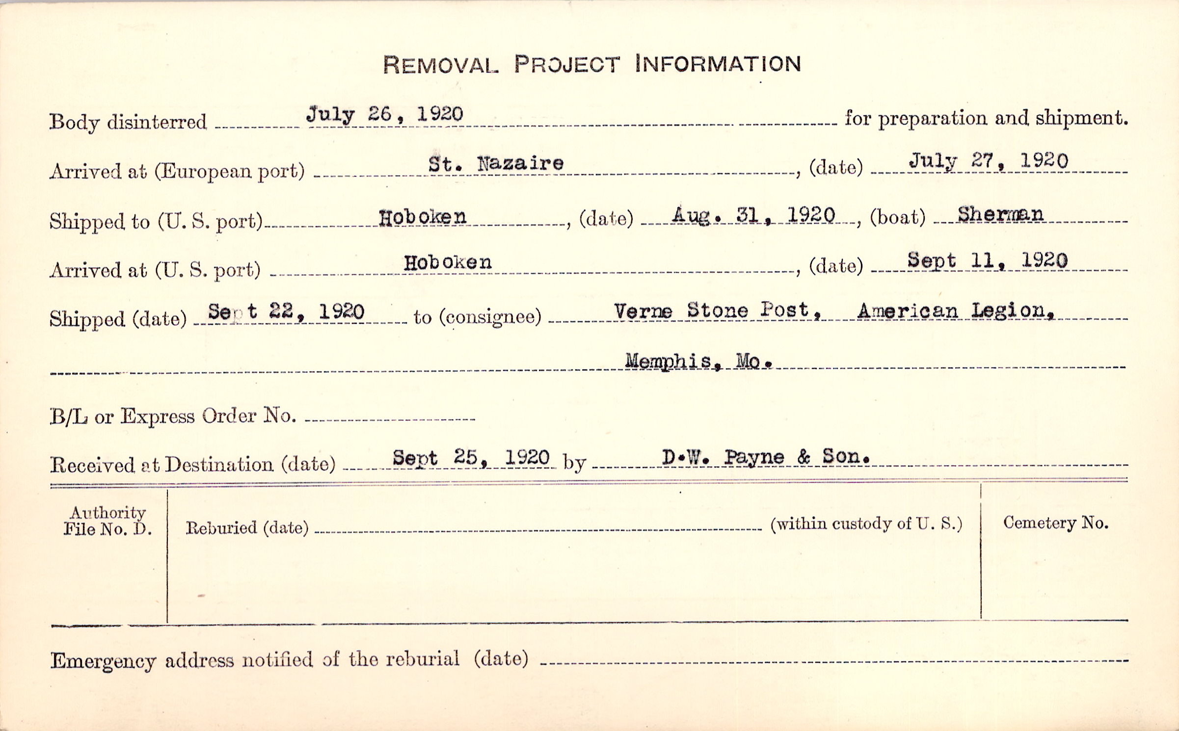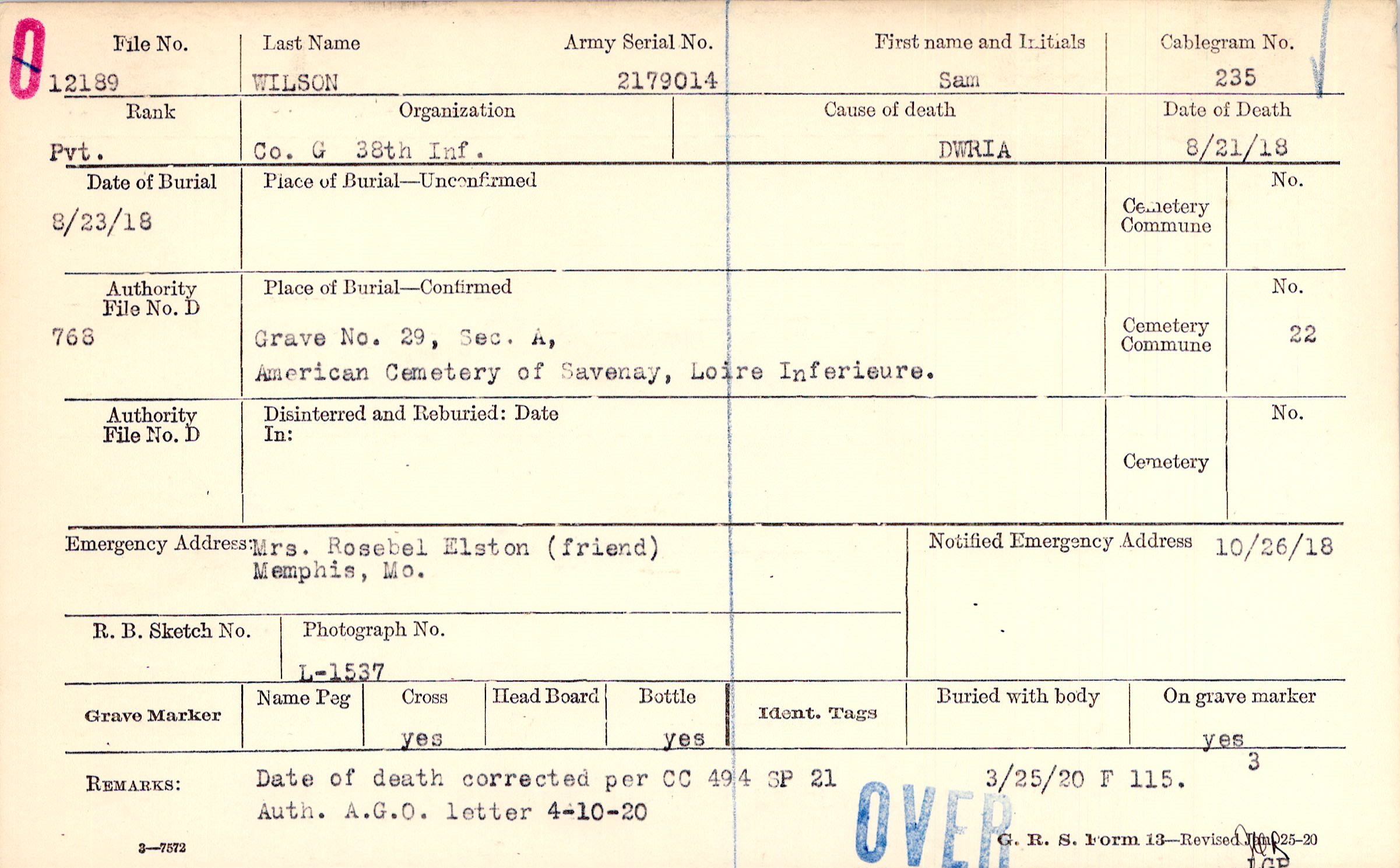 Grave 29, Sec. A, American Cemetery of Savenay, Loire Inferieure.