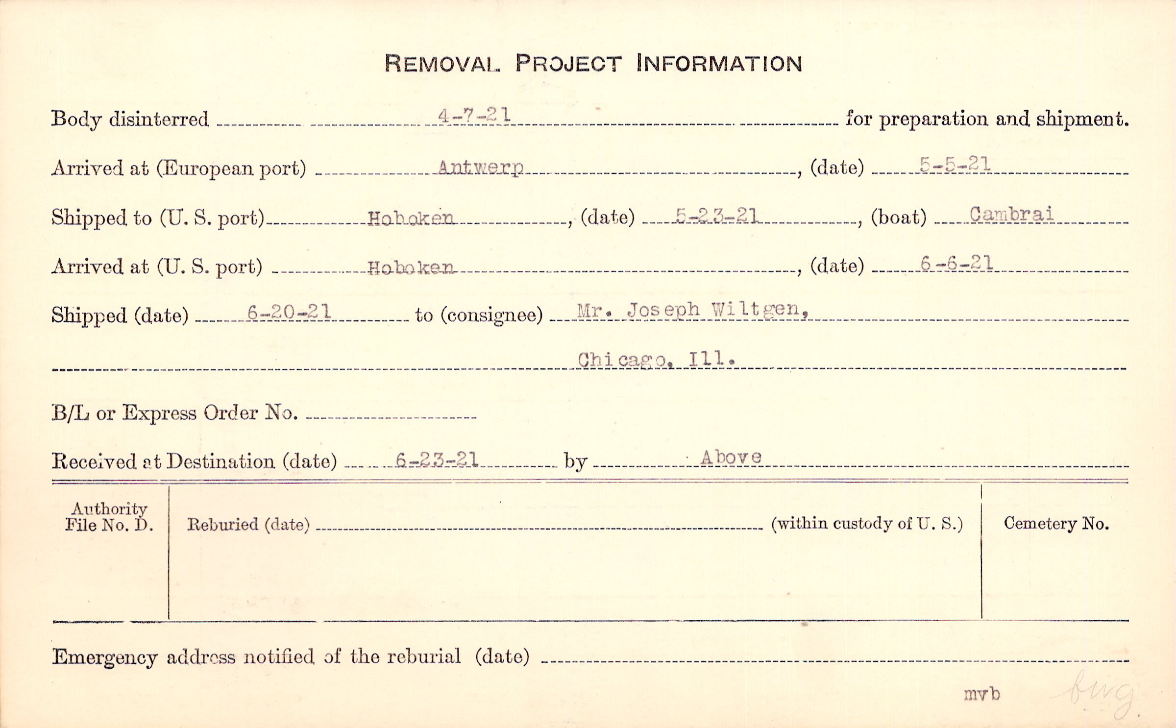 Body disinterred 4/7/1921 for preparation and shipment.