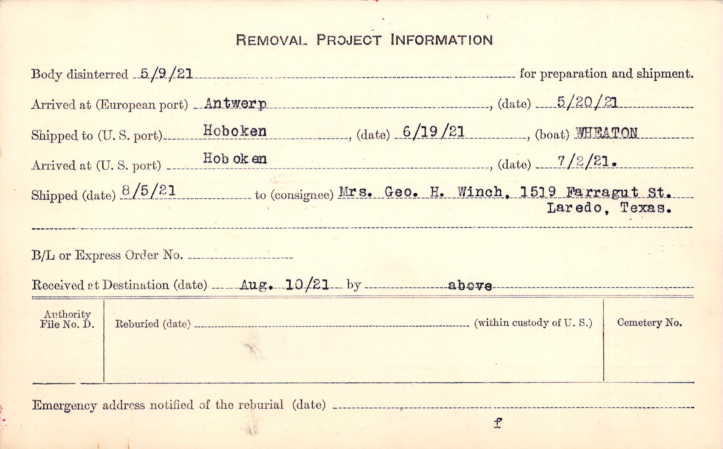 Body disinterred 5/9/1921 for preparation and shipment.