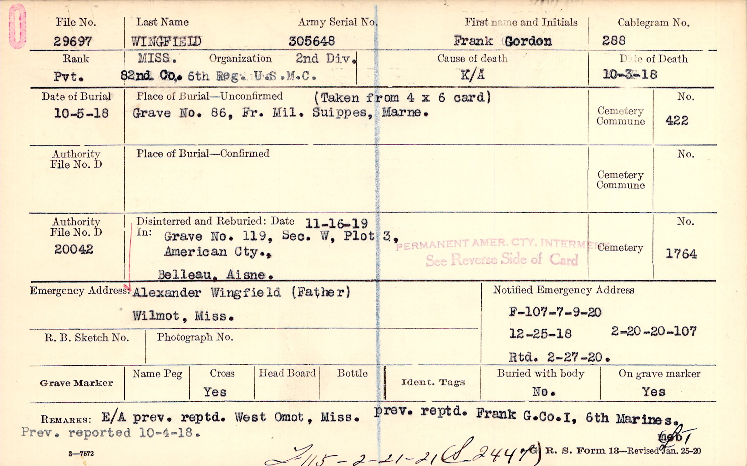 Form 107: /7/19920, 12/25/1918, Form 107: 2/20/1920, Rtd 2/27/1920