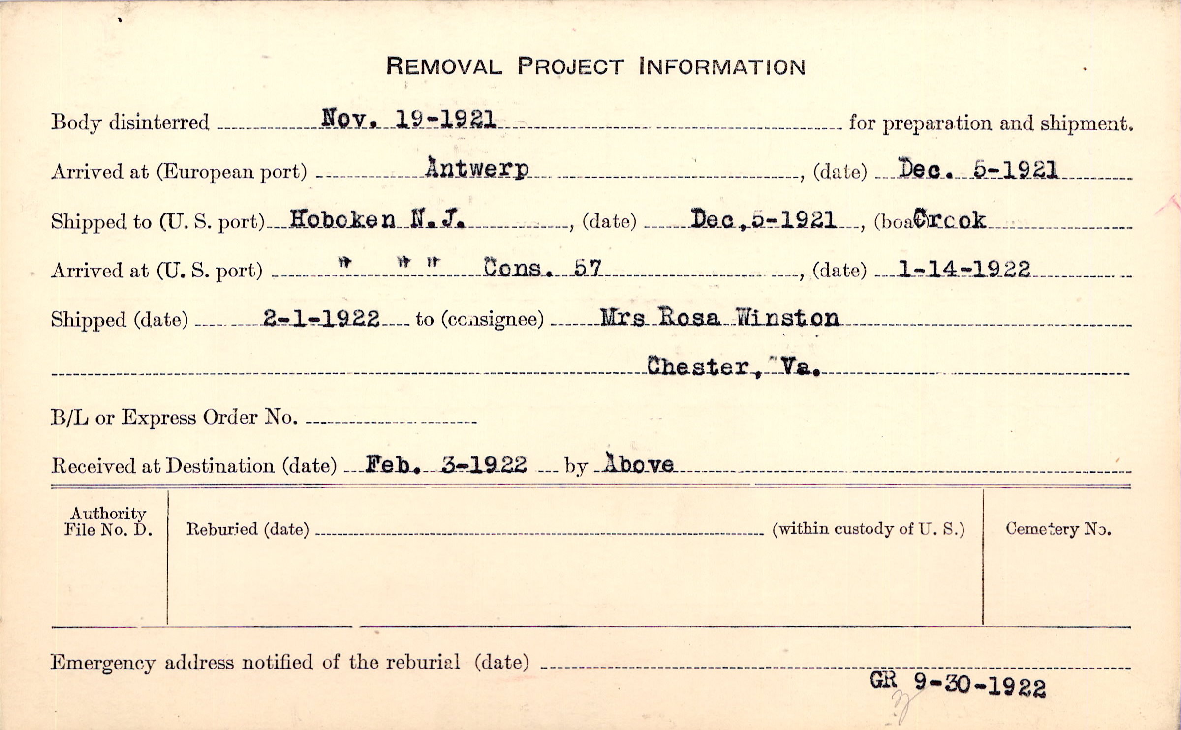 Body disinterred 11/19/1921 for preparation and shipment.
