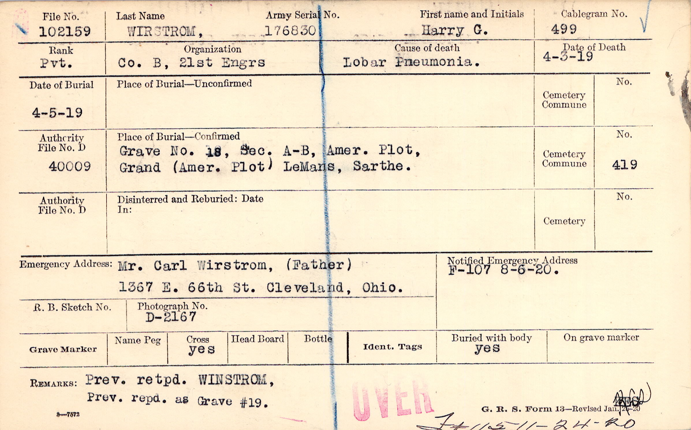 Mr. Carl Wirstrom, (Father), 1367 E. 66th St. Cleveland, Ohio.