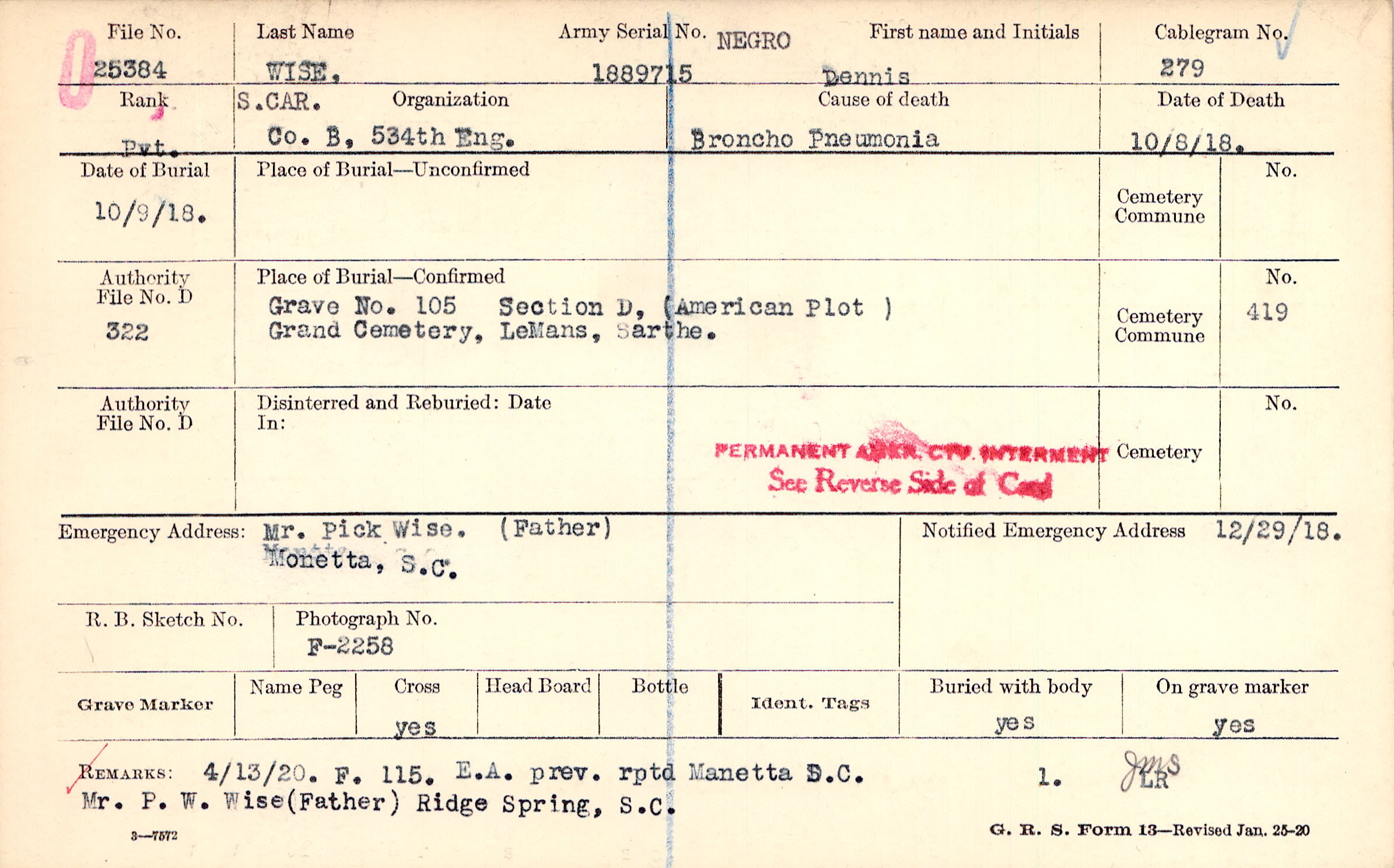 4/13/20. F. 115. E.A. prev rptd Manetta S.C. Mr. P.W. Wise (Father) Ridge Spring, S.C.