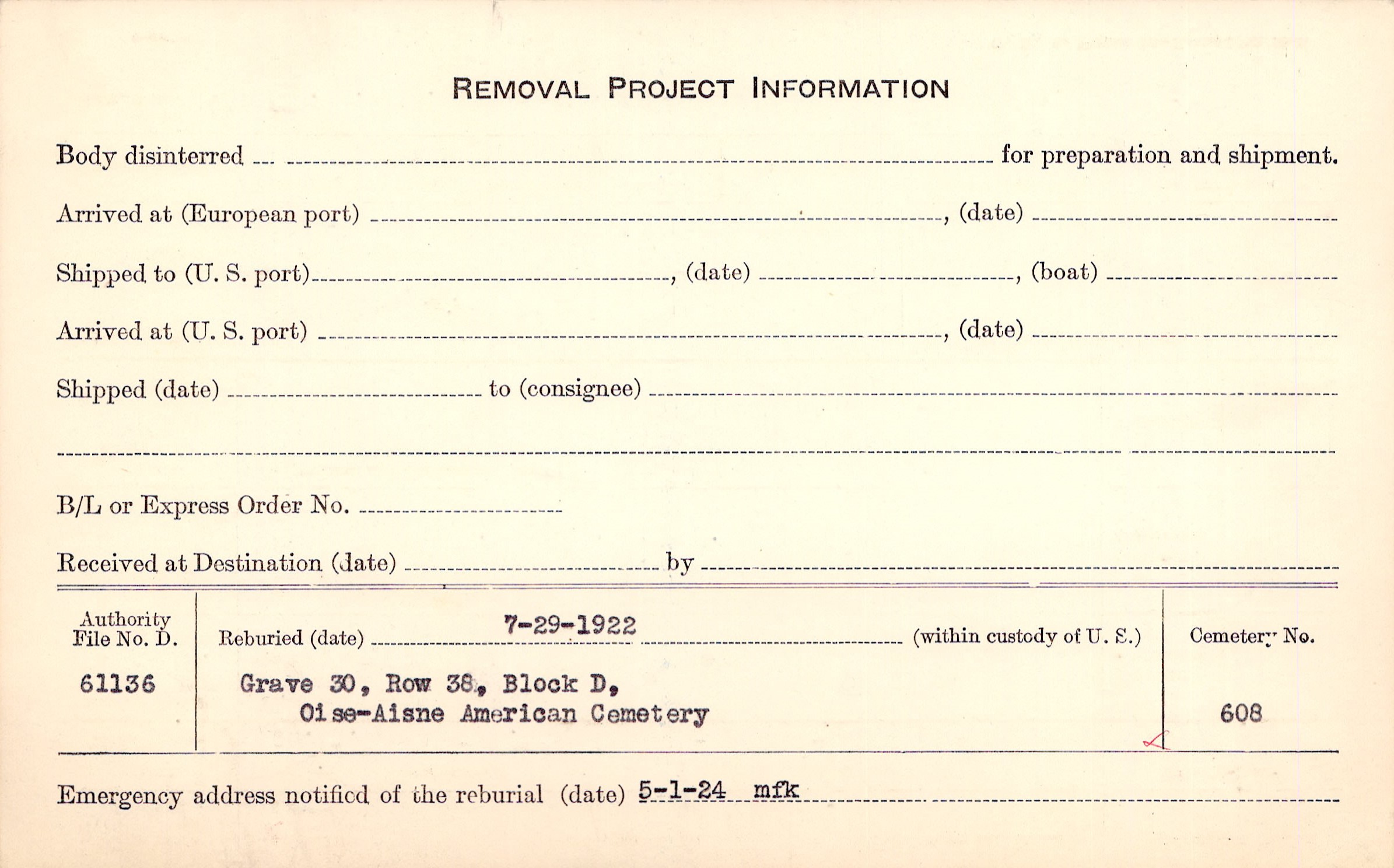 Grave 105, Section D (American Plot), Grand Cemetery, Le Mans, Sarthe.