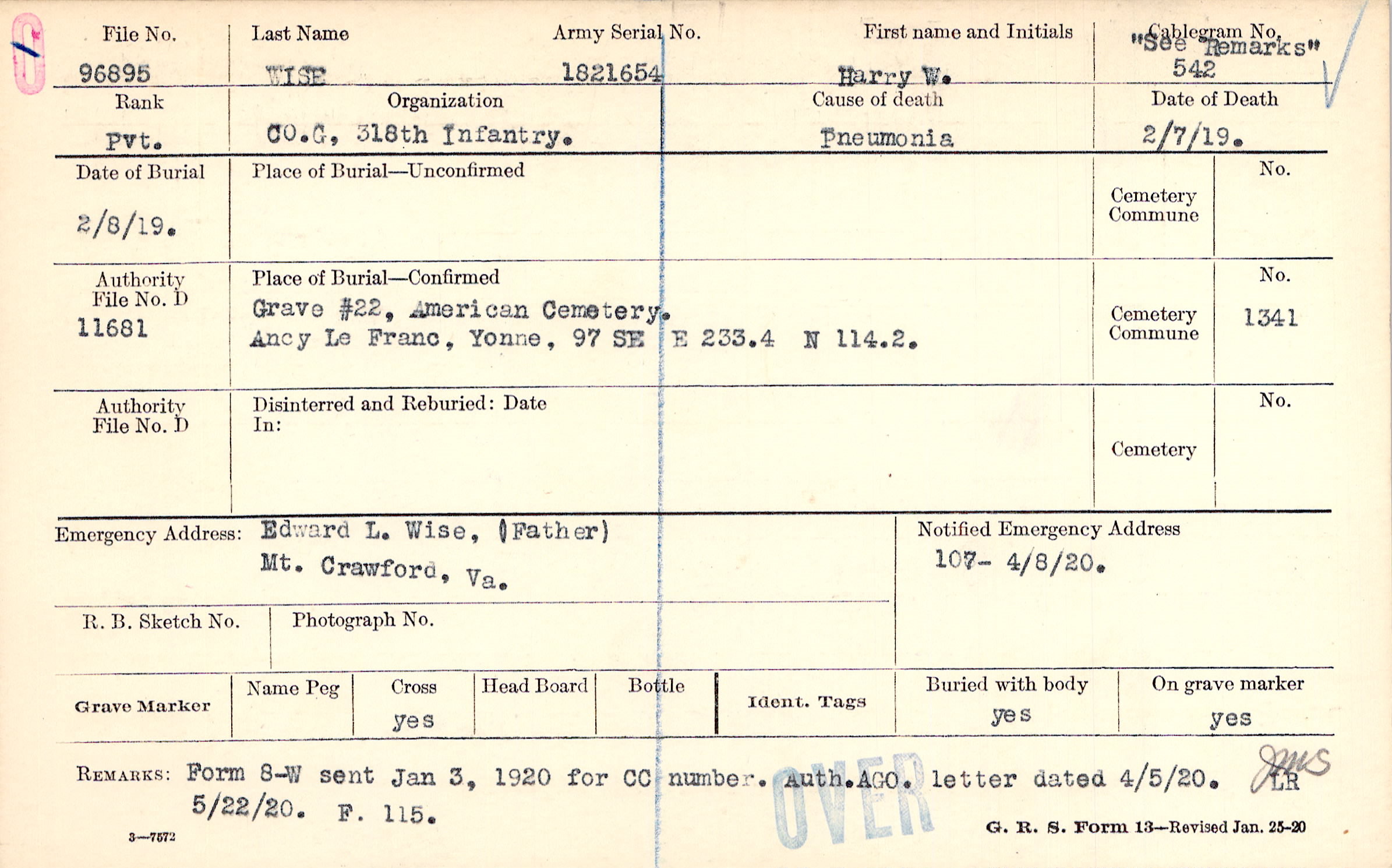 Grave #22, American Cemetery, Ancy Le Franc, Yonne, 97 SE