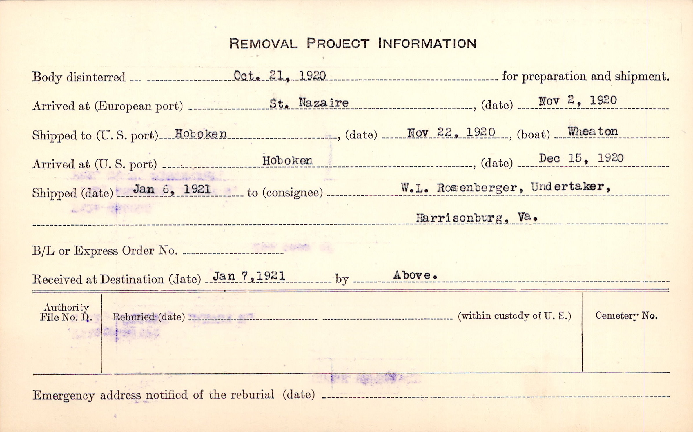 Body disinterred 10/21/1920 for preparation and shipment.