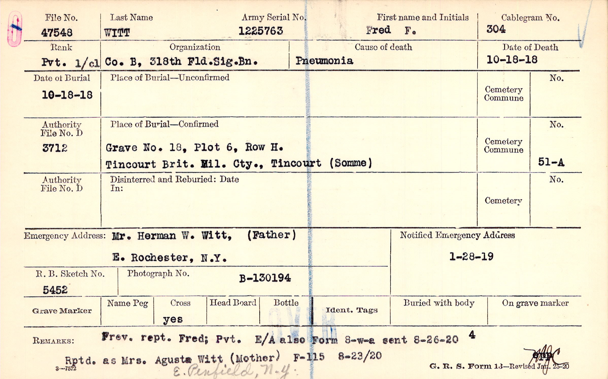 Prev. rept. Fred; Pvt. Rptd. as Mrs. Agusta Will (Mother) E. Penfield, N.Y., Prev. rept. Fred; Pvt. E/A also Form 8-w-a sent 8-26-20 Rptd. as Mrs. Agusta Witt (Mother), F-115 8-23/20