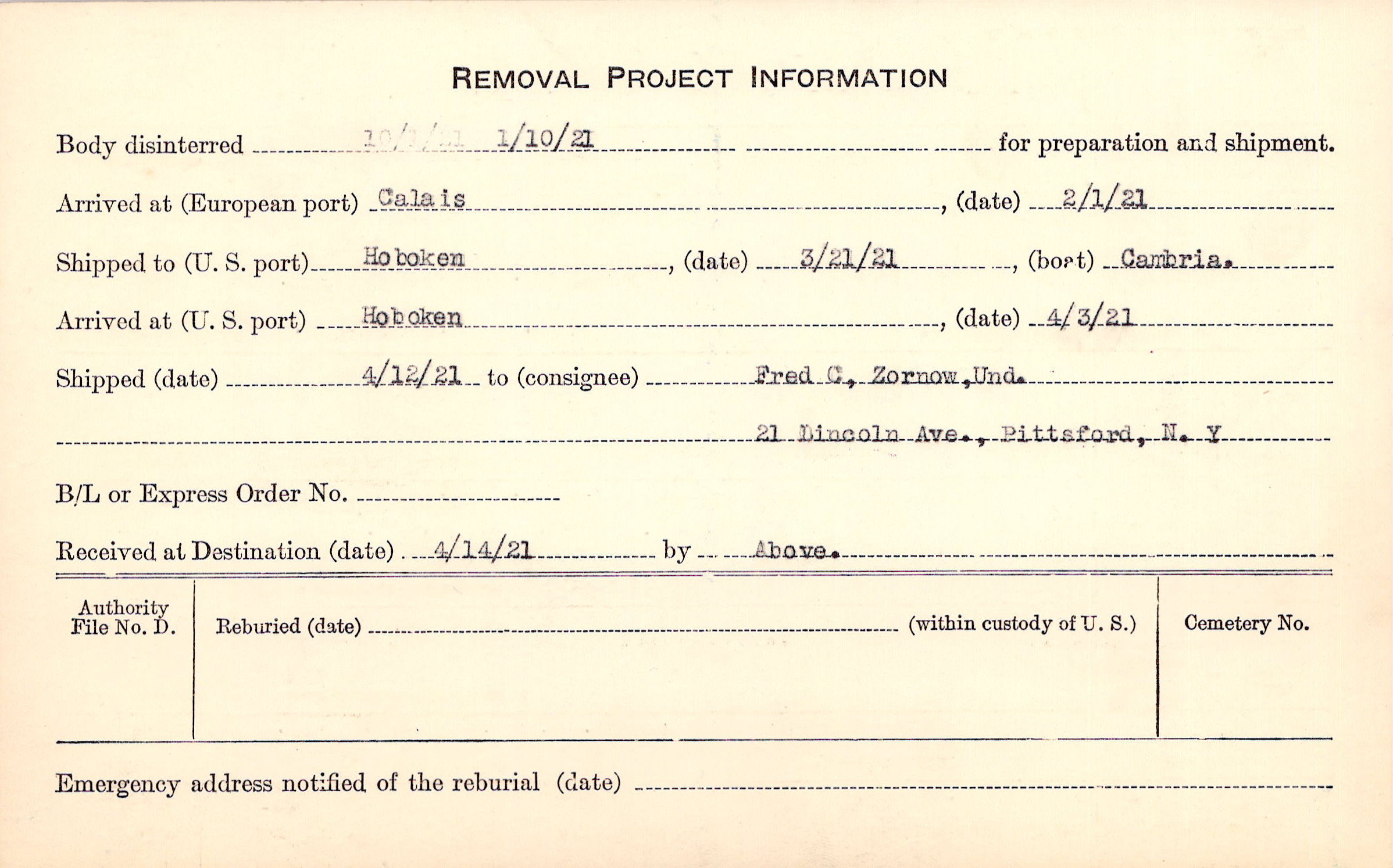 to Fred C, Zornow, Und., 21 Lincoln Ave., Pittsford, N.Y.