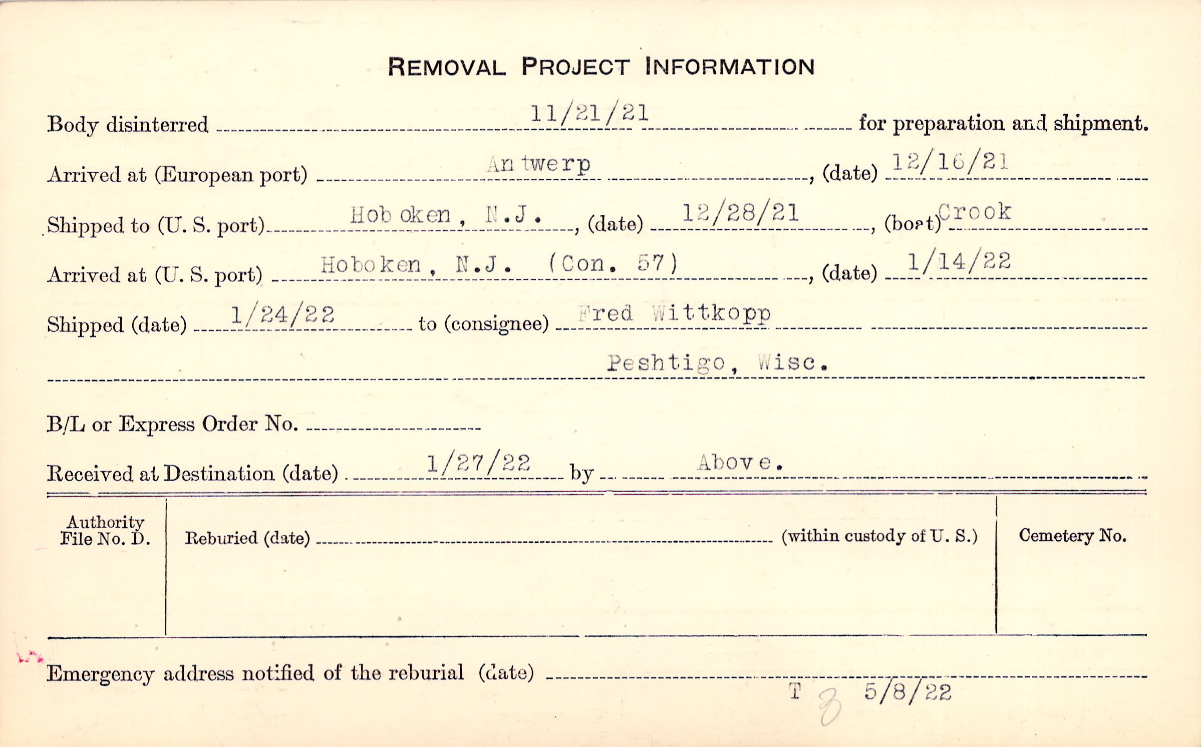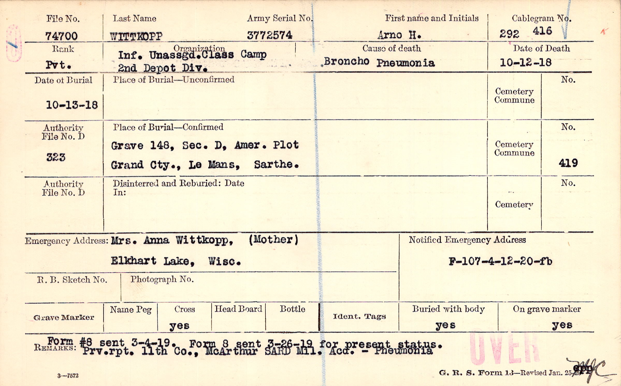 Grave 148, Sec. D, Amer. Plot,Grand Cty., Le Mans, Sarthe.