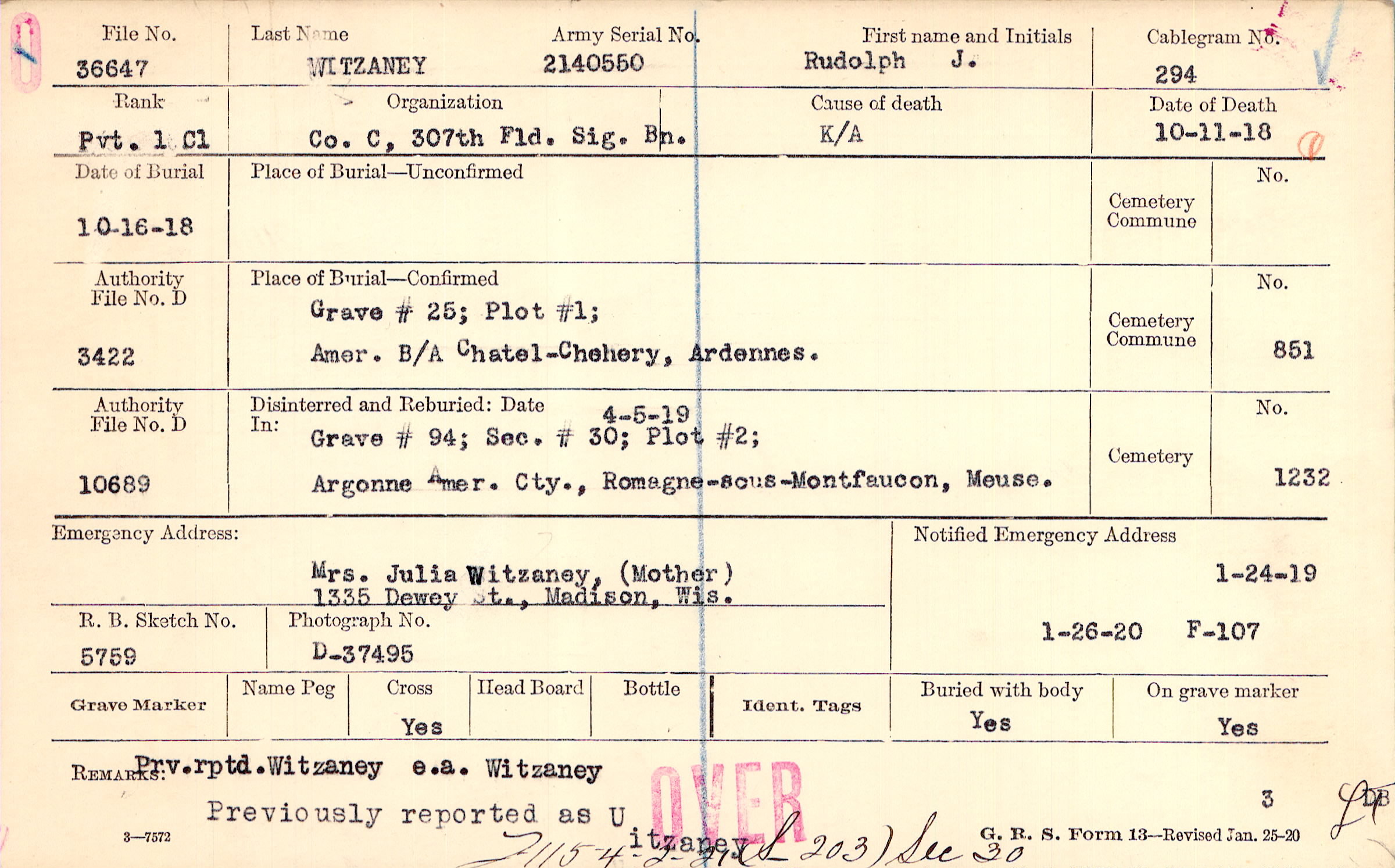 Mrs. Julia Witzaney, (Mother), 1335 Dewey St., Madison, Wis.