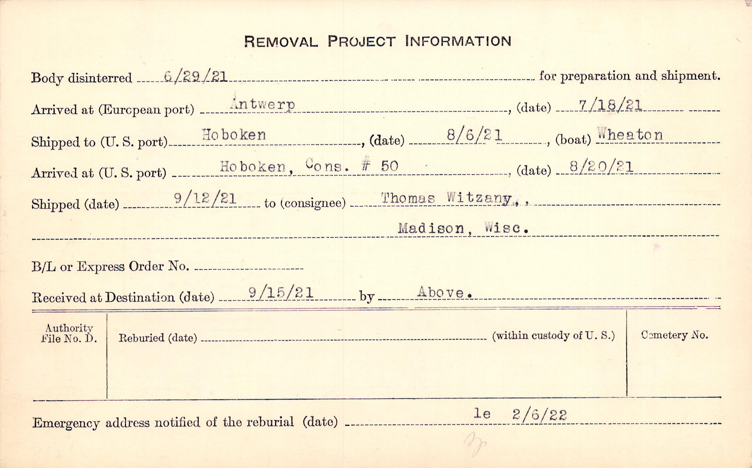 Body disinterred 6/29/1921 for preparation and shipment.