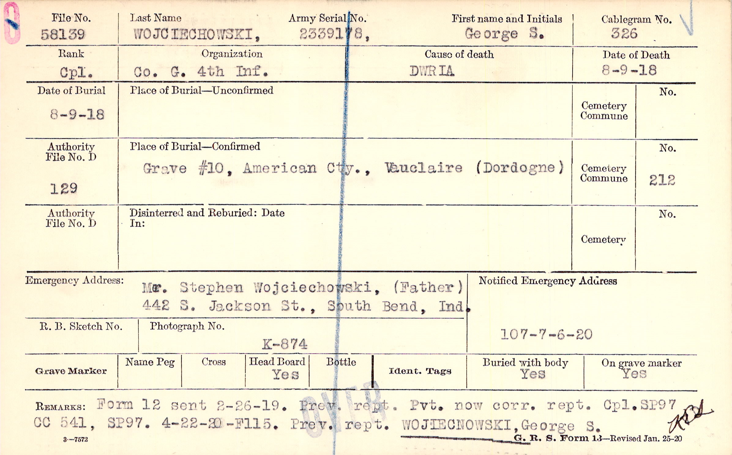 Form 12 sent 2-26-19. Prev. rept. Pvt. now corr. rept. Cpl. SP97 CC 541, SP97., 4-22-20-F115.